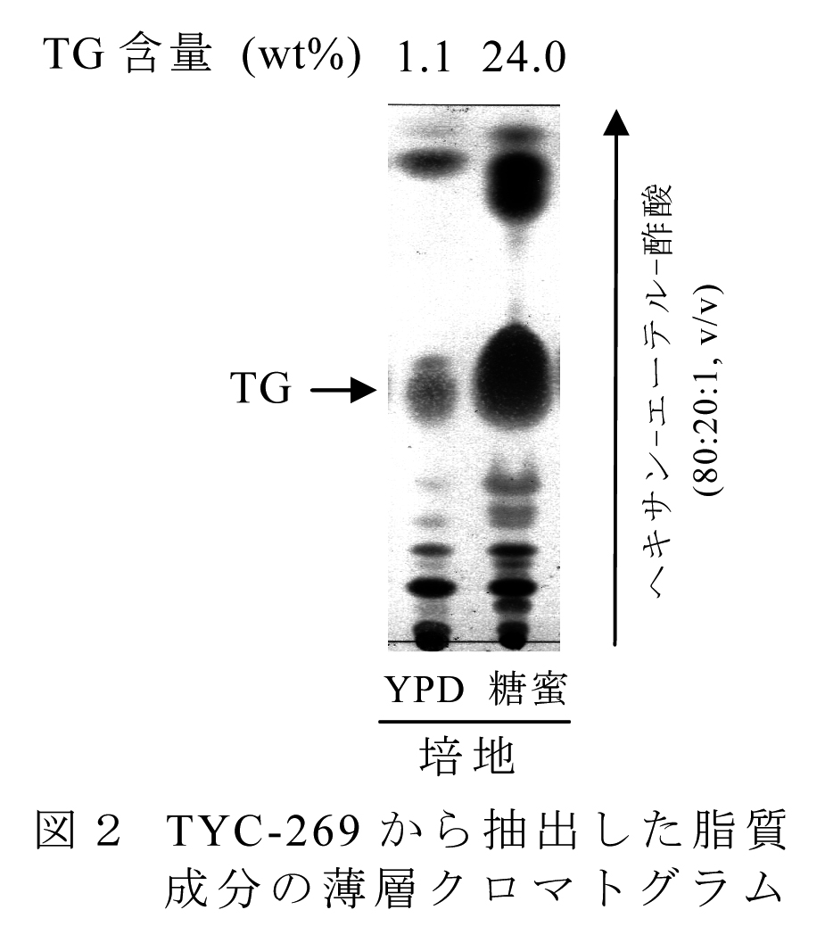 - TYC-269株は、てんさい糖蜜(糖濃度1% (w/v)に調整)、大豆由来窒素源1%、酢酸アンモニウム1%からなる培地 (初発pH7.0)により、30℃、200 rpmで30時間培養することで、TG含量が乾燥菌体重量当り24.0 wt%まで蓄積する (図2)。