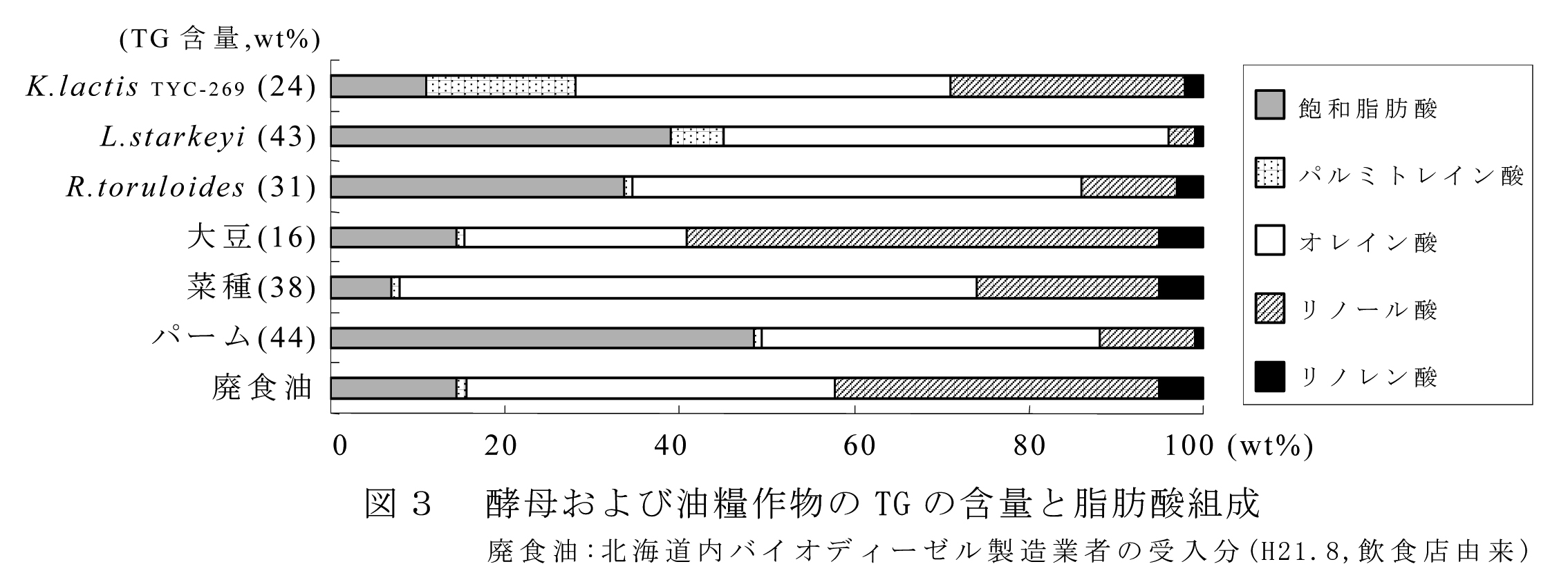 - TYC-269株のTGの脂肪酸は、飽和脂肪酸 (11%)、パルミトレイン酸 (17%)、オレイン酸 (43%)、リノール酸 (27%)およびリノレン酸 (2%)から構成される (図3)。