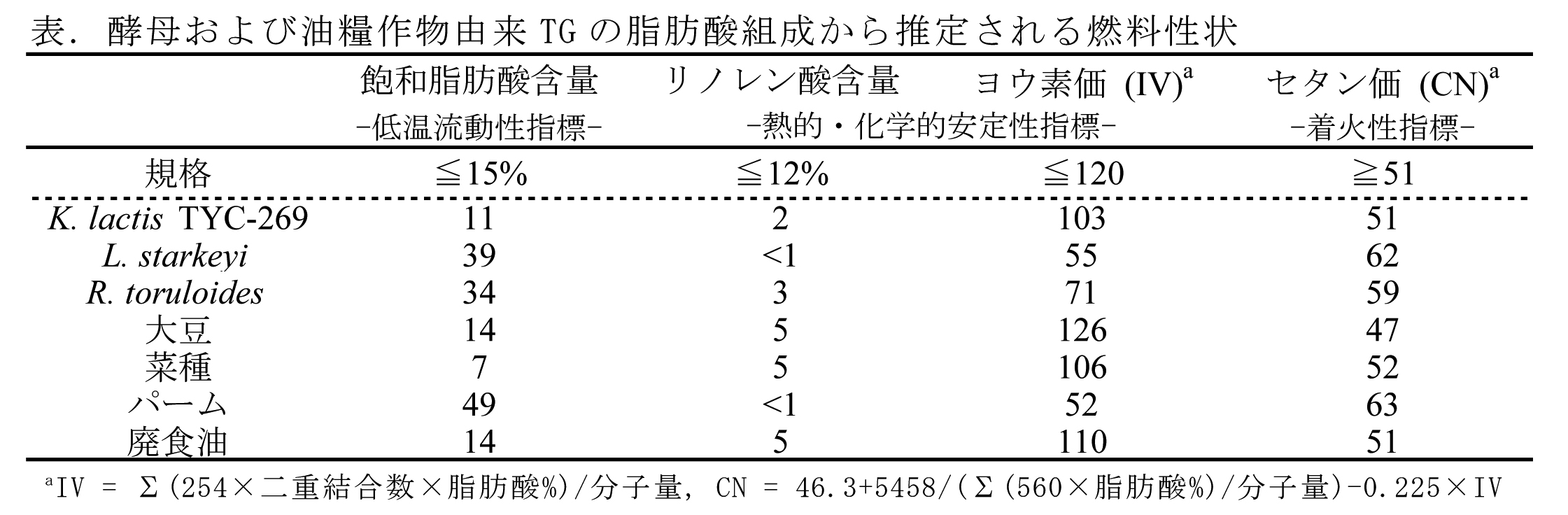 - TYC-269株から製造したバイオディーゼルのヨウ素価は103、およびセタン価は51と推定される(表)。TYC-269株は、菜種および廃食油を原料とした場合と同様に、全国バイオディーゼル燃料利用推進協議会の4項目の規格(飽和脂肪酸含量(≦15%)、リノレン酸含量(≦12%)、ヨウ素価(≦120)およびセタン価(≧51, 揮発油等の品質の確保等に関する法律では≧45))にすべて適合する。