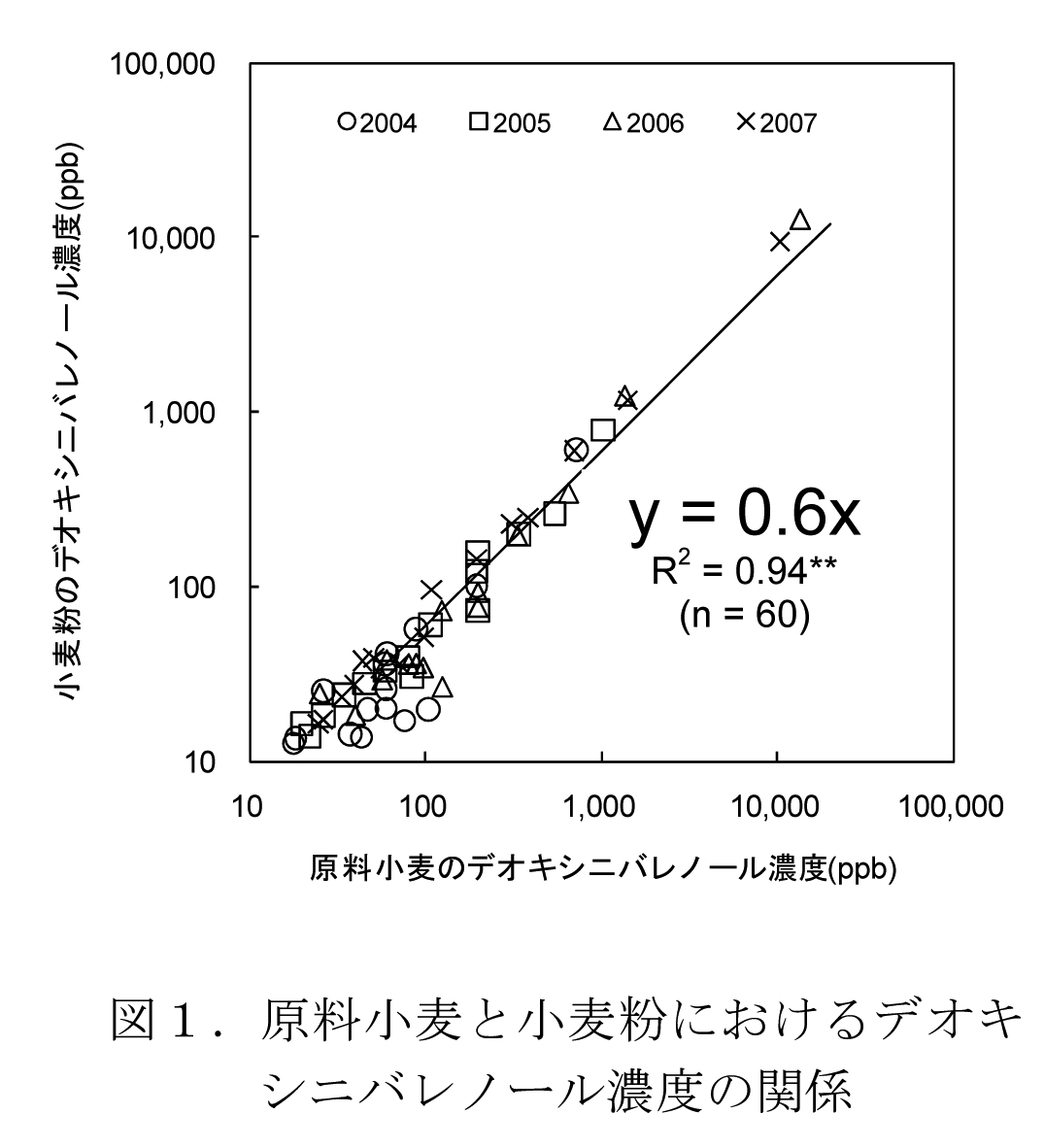 - 小麦粉に含まれるデオキシニバレノール濃度(y)は、原料の濃度(x)とy=0.6xの回帰式で表され、原料のおよそ半分の濃度である(図1)。