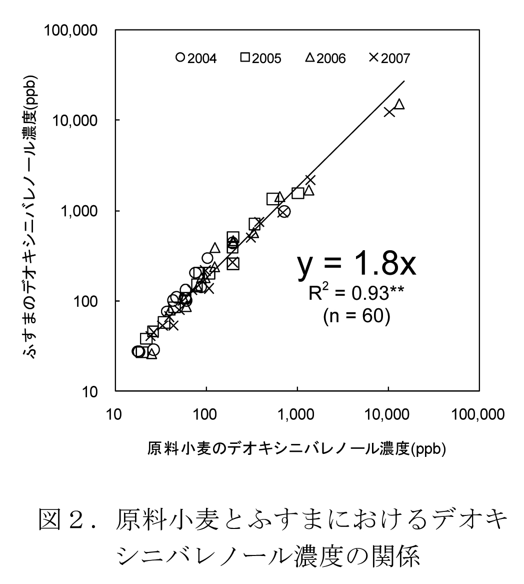 - ふすまに含まれるデオキシニバレノール濃度(y)は、原料の濃度(x)とy=1.8xの回帰式で表され、原料のおよそ2倍の濃度である(図2)。
