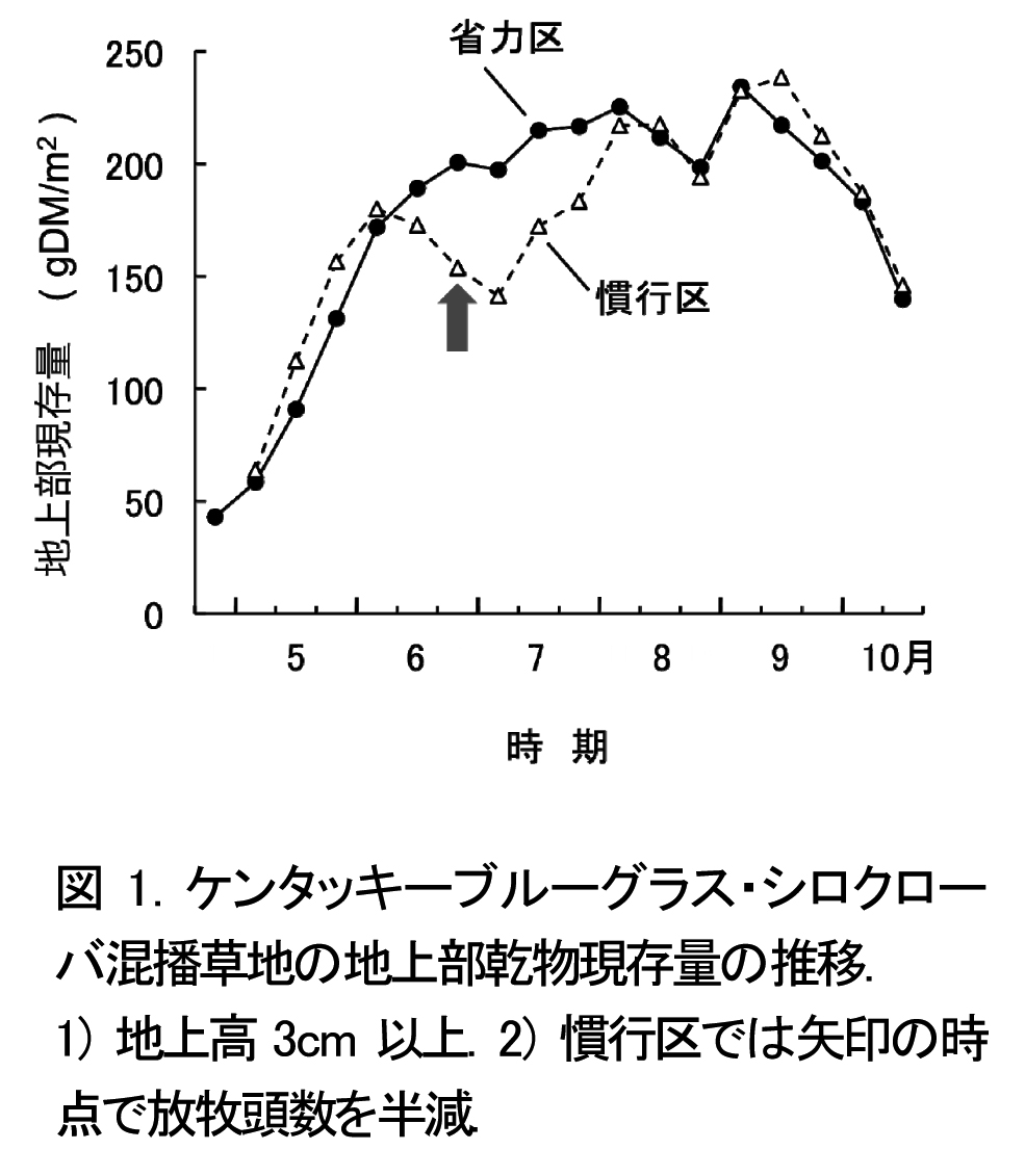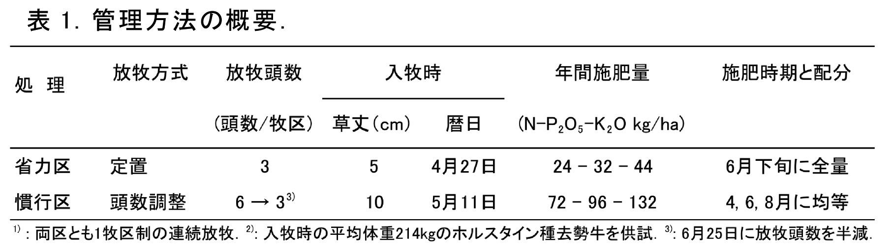 - 省力管理法(省力区)ではスプリングフラッシュ時の余剰草の発生を抑制するため、季節生産性の平準なケンタッキーブルーグラス・シロクローバ混播草地を用いる。さらに、入牧時期を早め(草丈5cmの時点で入牧)、施肥量を標準施肥の1/3程度に減らしてスプリングフラッシュ後に全量施用する(表1)。