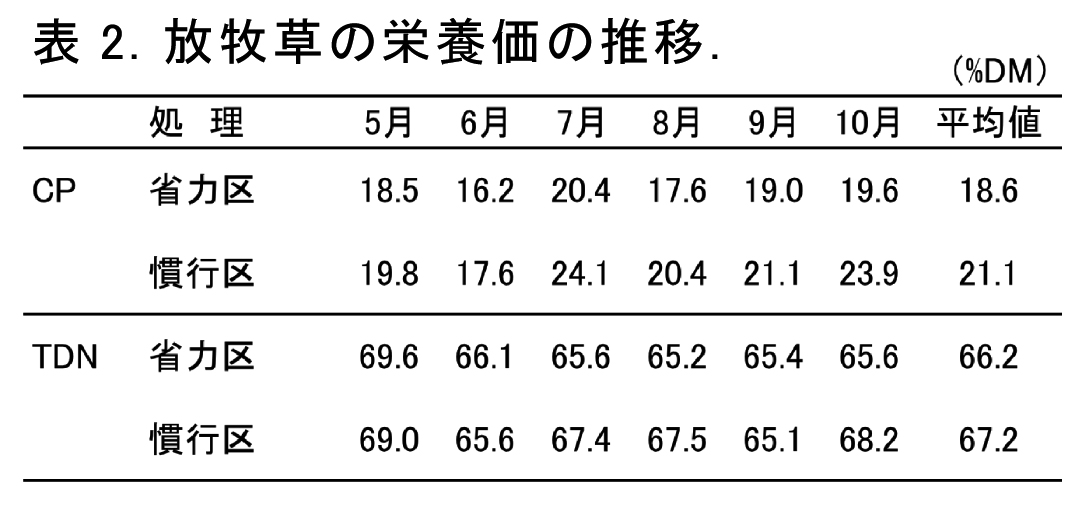 - 放牧草の粗タンパク(CP)含量の年間平均値は約19%で、慣行区より低下するものの、最低限必要とされる12%以上を確保できる。また、推定可消化養分総量(TDN)含量は年間平均値で66%であり慣行区とほぼ同等である(表2)。