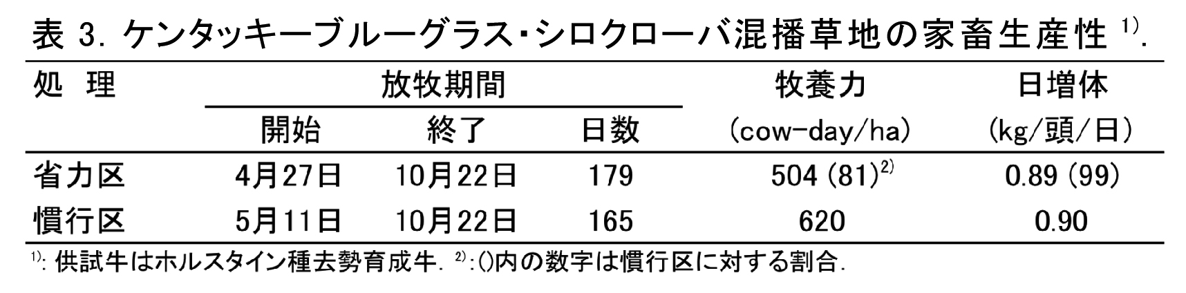 - 省力区における家畜生産性をホルスタイン種去勢育成牛でみると、牧養力は504CD/ha、日増体量が0.89kg/頭/日である(表3)。この水準は、慣行区と比較して、牧養力で8割程度、個体当たりの日増体量で同水準が確保できる良好なものである。
