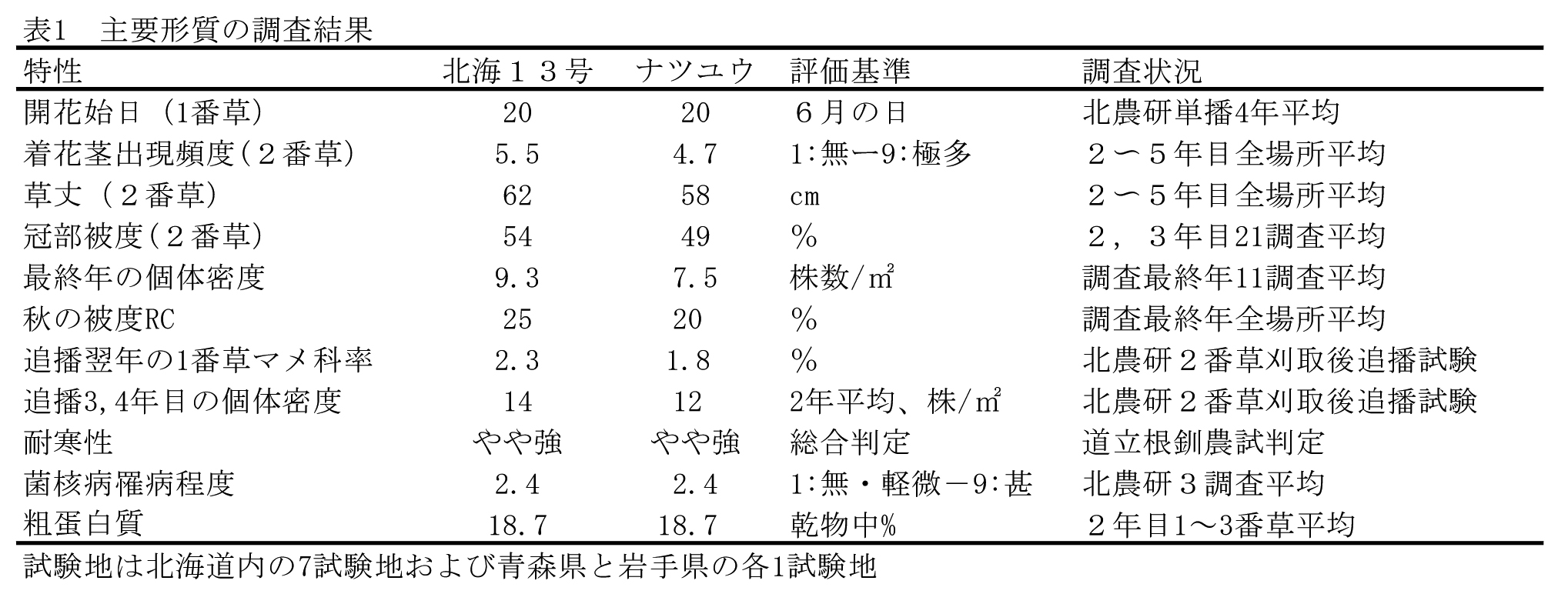 - 競合力は2番草刈取り時の着花茎出現頻度が0.8ポイント上回り、草丈が4cm高く、さらに冠部被度も5%高いことから「ナツユウ」よりも強い (表1)。