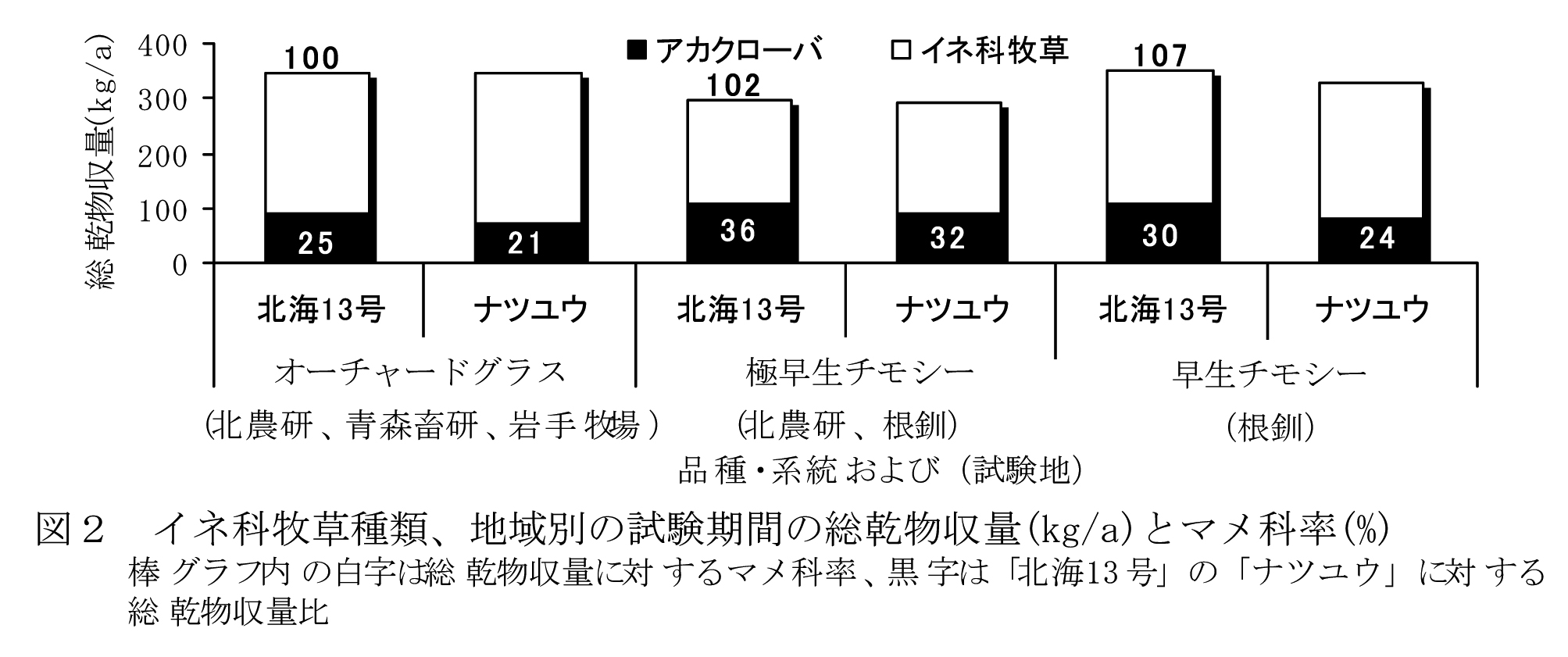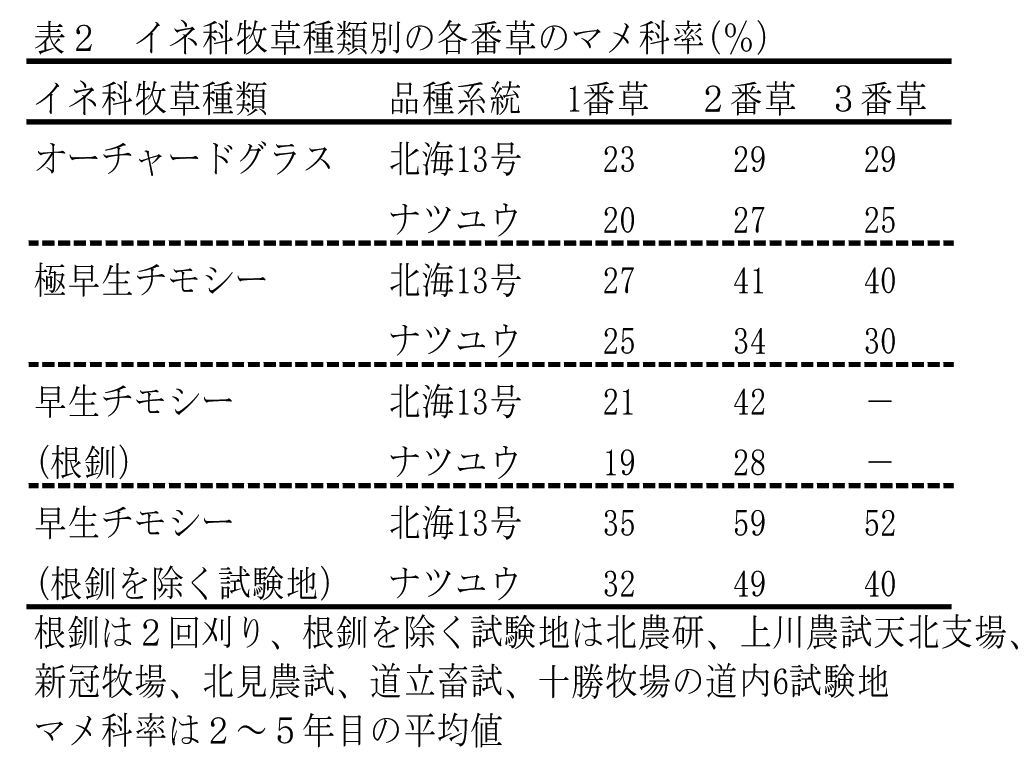 - 早生チモシーとの混播組合せは、根釧では2番草のマメ科率は42%とやや高く、番草間の変動幅がやや大きいものの (表2)、総乾物収量はやや多く、マメ科率は30%(図2)と混播適性が良好で、優れる。一方、根釧地域以外では2番草のマメ科率が59%と高く (表2)チモシーに対する抑圧がみられるので、組合せは適当でない。