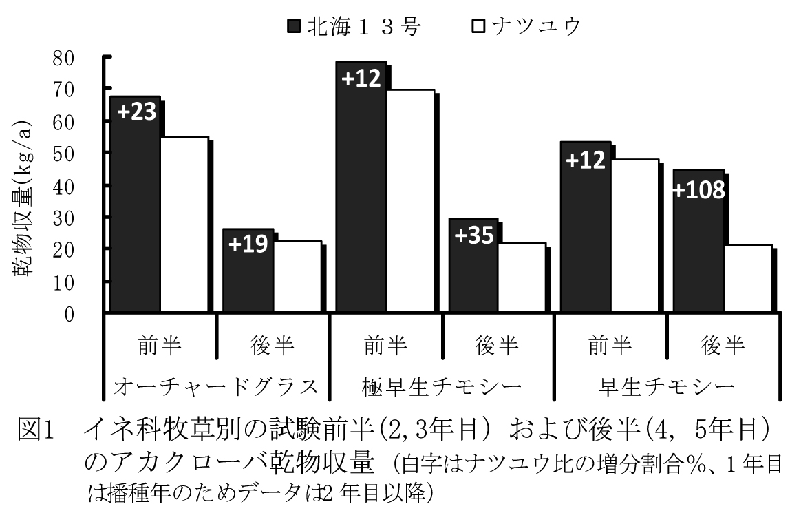 アカクローバ「北海13号」は、早生の2倍体で、永続性に優れ、オーチャードグラスおよび極早生チモシーと混播した場合、「ナツユウ」と比べ4、5年目でもアカクローバ収量を高く維持できる。