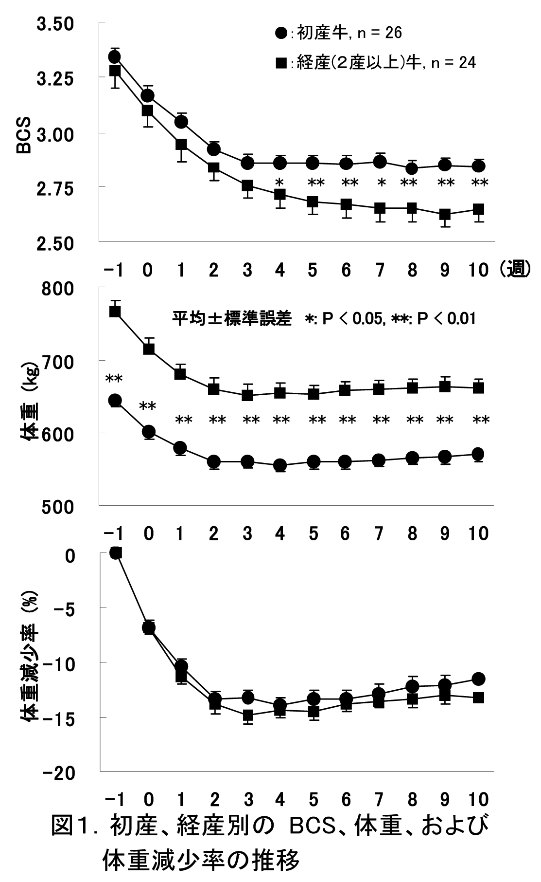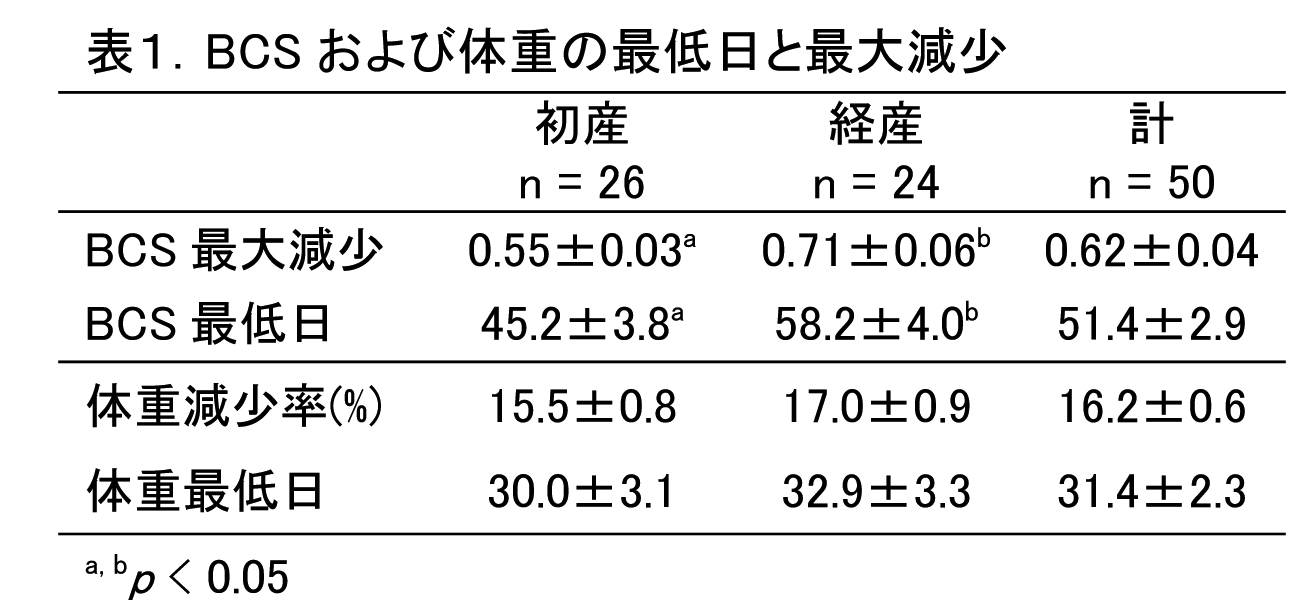 - BCSの最大減少幅は経産牛で大きく、最低になる日は初産牛よりも約2週間遅れる。これに対し、体重減少率では、減少率は16%前後、最低日は31日前後と、BCSのような違いは認められない(表1)。体重にはエネルギーバランスだけではなく、採食量の増加が反映される結果と推測できる。