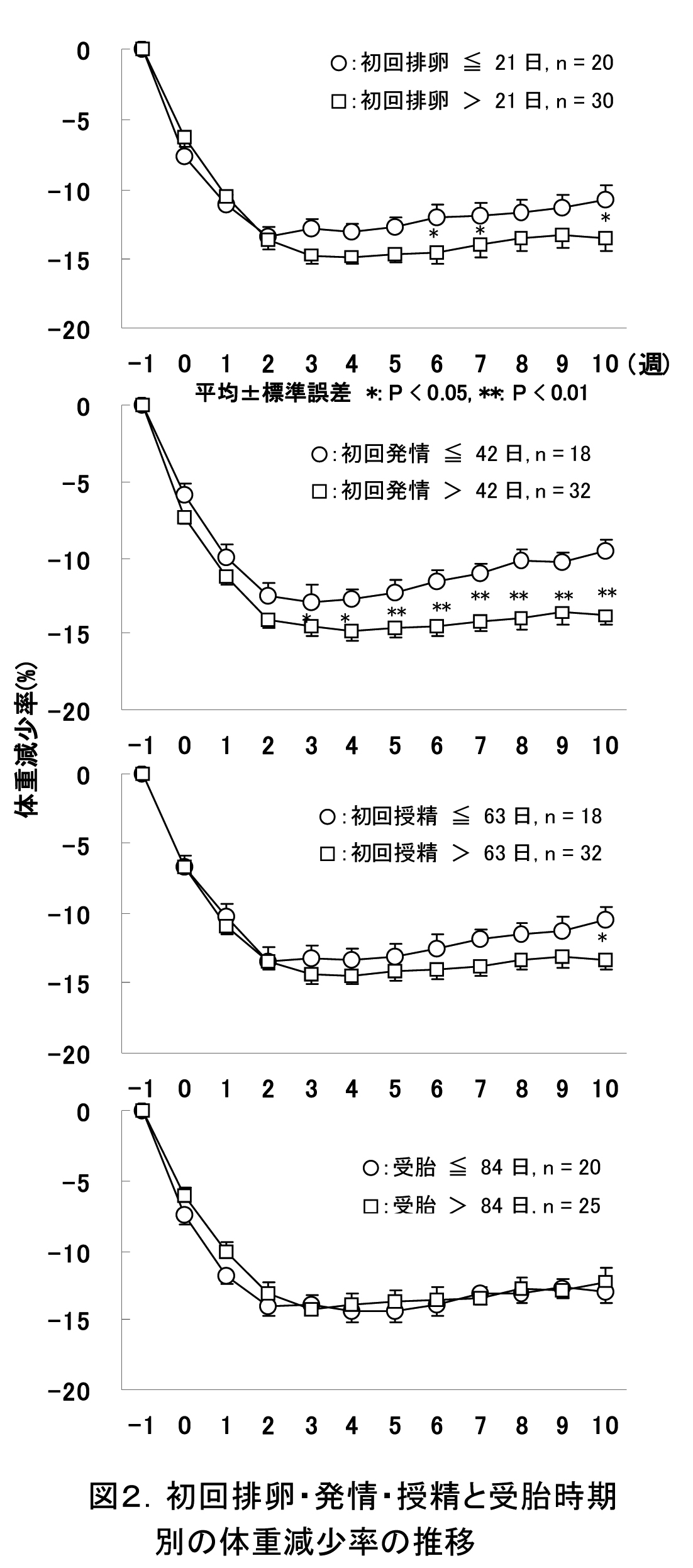 - 初産・経産をまとめると、BCSでは排卵や発情の時期による違いは見られないが、初回排卵の早い群(21日以内)では遅い群よりも体重増加に転ずる時期が早く、初回発情の早い群(42日以内)でも同様に、体重の回復が早く始まる(図2)。