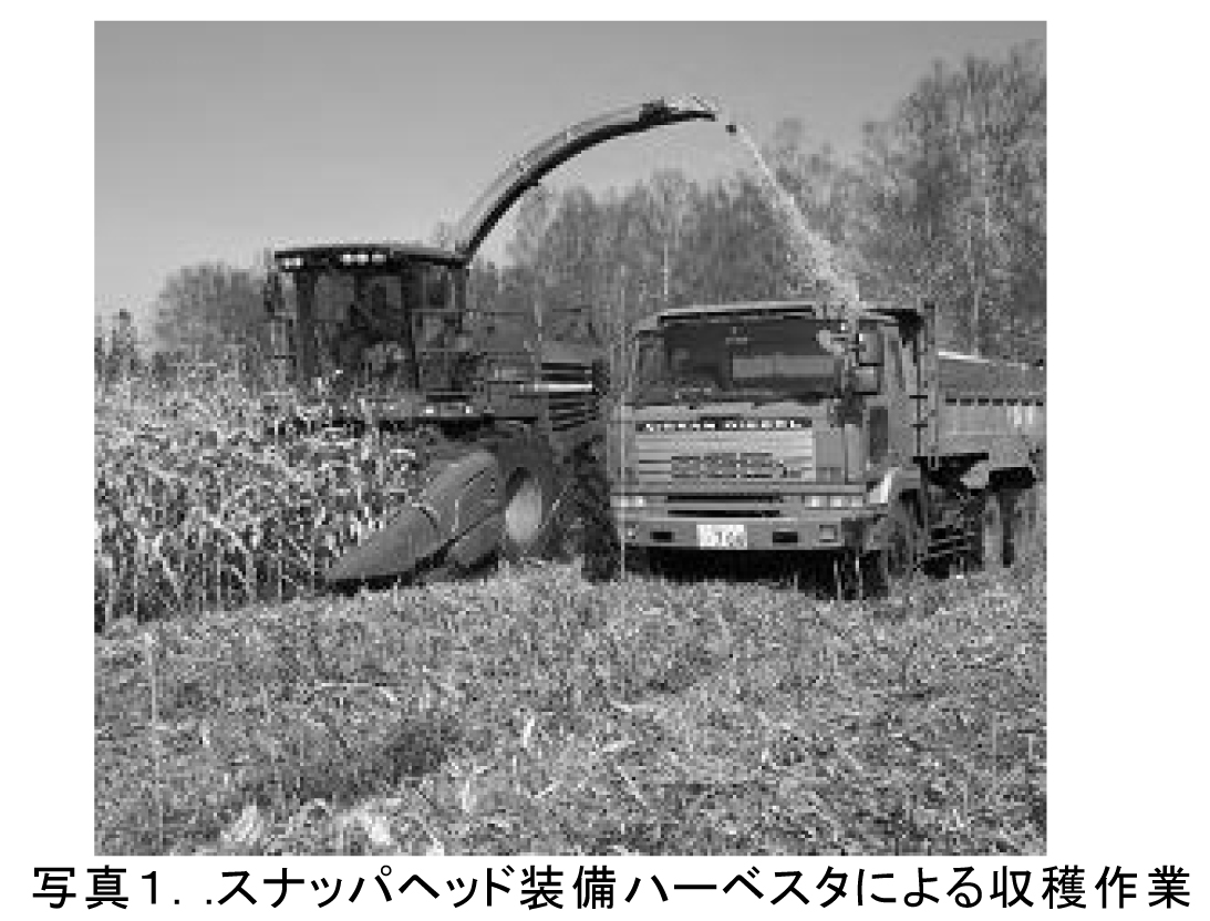 スナッパヘッド装備の自走式フォレージハーベスタは、とうもろこしの雌穂(イアコーン)をホールクロップ並の作業能率で収穫できる。収穫したイアコーンを密封すれば発酵品質がよく、乳牛の嗜好性や栄養価の高いサイレージが調製できる。