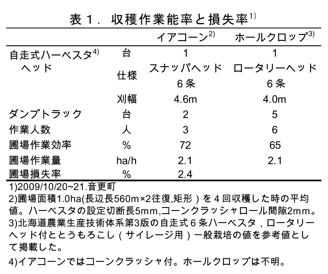 - 6条刈りスナッパヘッド(J社製606C)を装備したコーンクラッシャ付の自走式フォレージハーベスタ(J社製7400)と併走ダンプトラック2台で、黄熟後期以降のイアコーンをハーベスタの設定切断長5mm,コーンクラッシャのロール間隙2mmで収穫する場合の作業能率は圃場作業量が2.1ha/hで、圃場におけるイアコーンの損失率は2.4%である(図1、表1)。なお圃場へ還元される茎葉は、乾物重量比でとうもろこし全体の42%である。