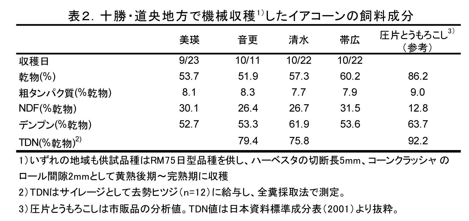 - 機械収穫したイアコーンサイレージ原料の飼料成分は、乾物率が平均55.8%(51.9〜60.2%)、粗タンパク質(CP)含量が平均8.0%(7.7〜8.3%)、中性デタージェント繊維(NDF)含量が平均28.7%(26.4〜31.5%)、デンプン含量が平均55.4%(52.7〜61.9%)であり、圧片とうもろこしよりも繊維含量が高く、デンプン含量が低いものの、調製したイアコーンサイレージの可消化養分総量(TDN)は平均で77.6%乾物と査定され、配合飼料並の栄養価である。
