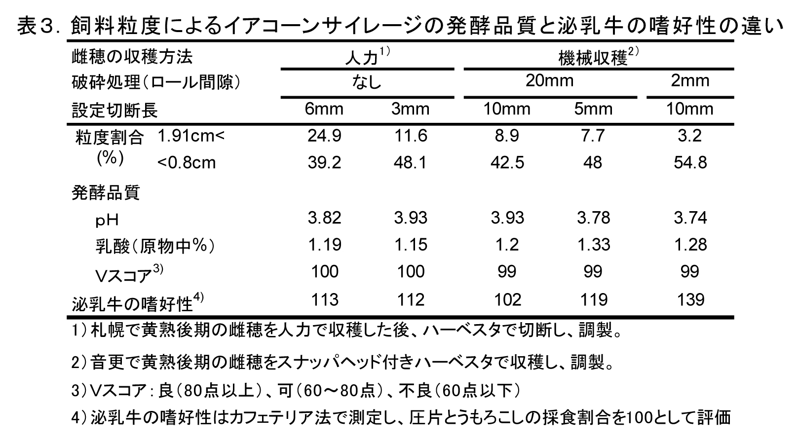 - イアコーンは調製時の切断長や破砕処理の有無等の調製条件に関わりなく、密封貯蔵すると乳酸発酵した良質なサイレージに調製できる(表3)。イアコーンサイレージに対する泌乳牛の嗜好性は圧片とうもろこしと同等以上である(表3)。