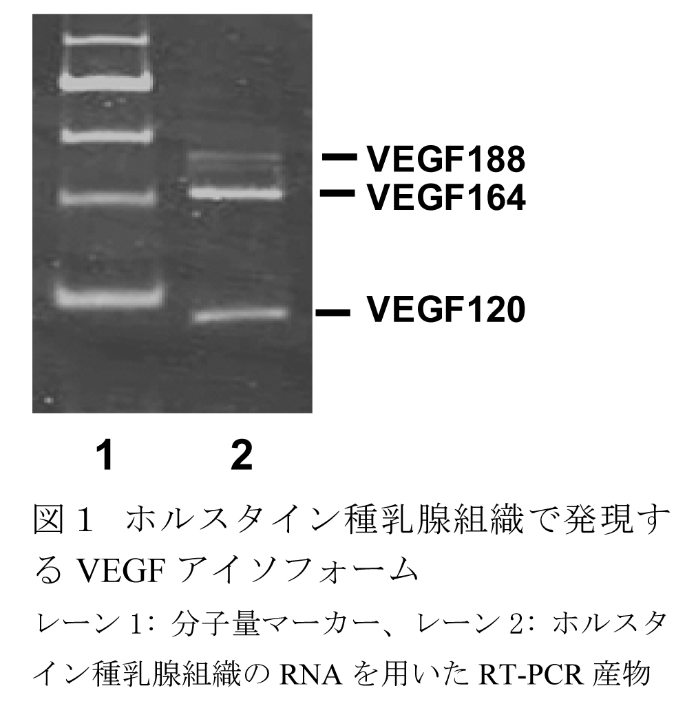 - 選択的スプライシングによって生じるVEGFのアイソフォームをRT-PCR法で解析した結果から、泌乳中期のホルスタイン種乳腺組織ではVEGF120、164、188が発現している(図1)。