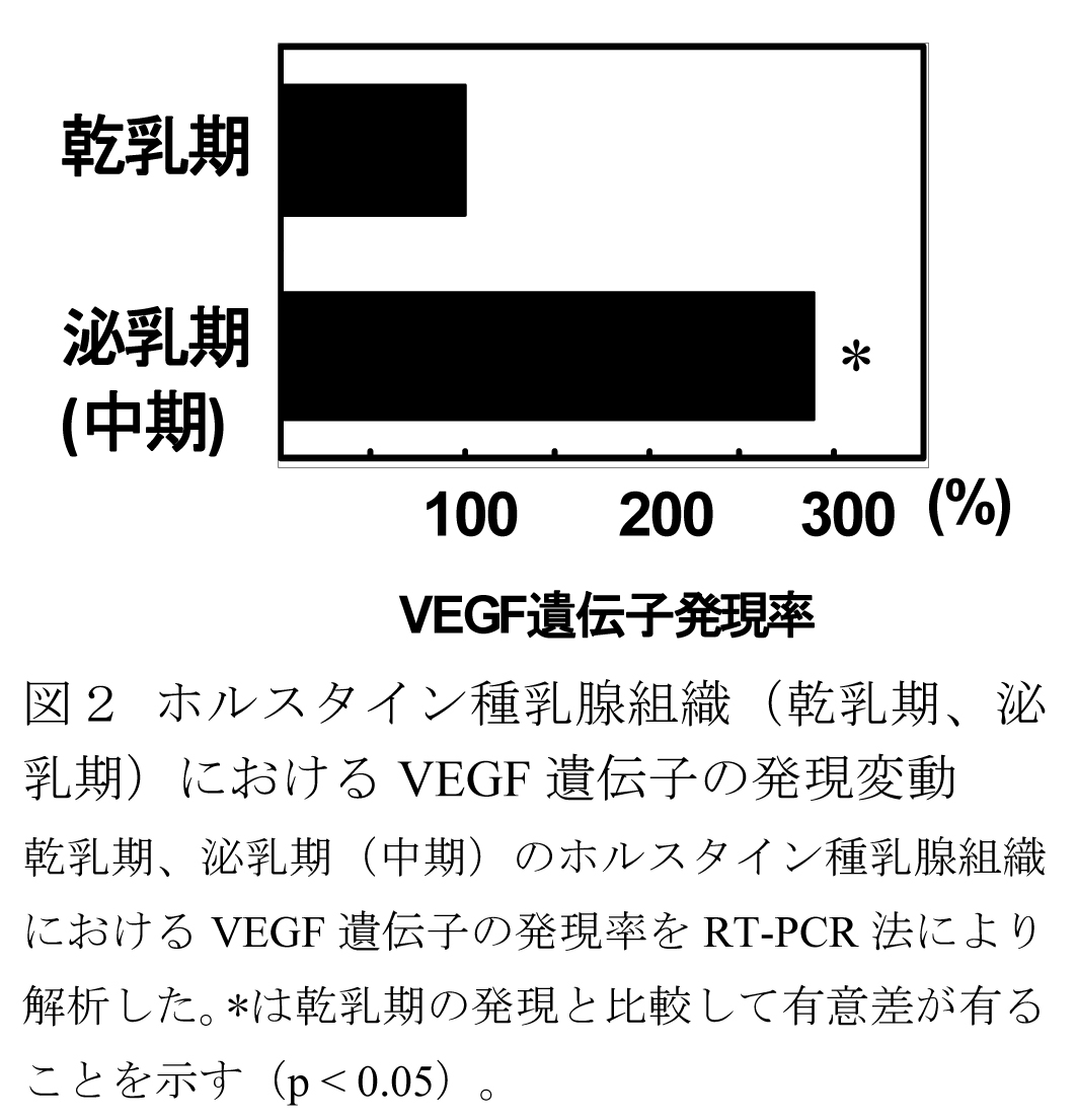 - 3種類のアイソフォームcDNAの共通領域に対応するプライマーを用いたRT-PCR法の結果から、ホルスタイン種の乳腺組織におけるVEGFmRNAの発現は、泌乳中期に乾乳期の約3倍に増大する(図2)。