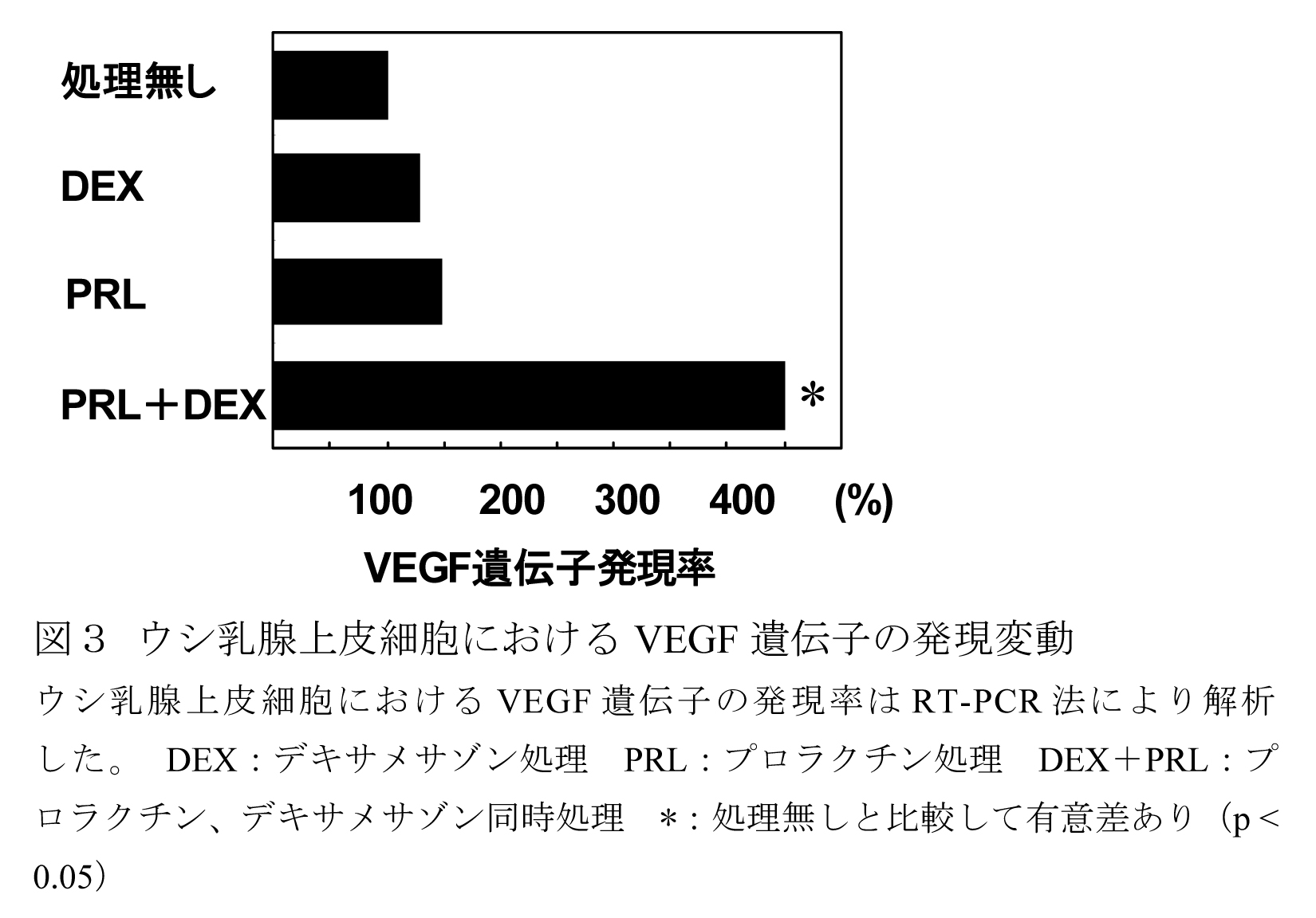 - ウシ乳腺上皮細胞におけるVEGFmRNAの発現は、ヒツジ脳下垂体由来プロラクチンと合成グルココルチコイドであるデキサメサゾンの同時処理で増大する(図3)。