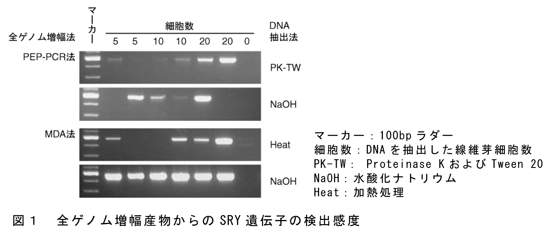 - Multiple displacement amplification (MDA)法により全ゲノム増幅を行う場合、加熱処理による従来法よりもNaOHによりDNA抽出をした場合にSRYの検出感度が高く、Primer extension preamplification-PCR (PEP-PCR)法に比較しても全ゲノム増幅効率が高い(図1)。