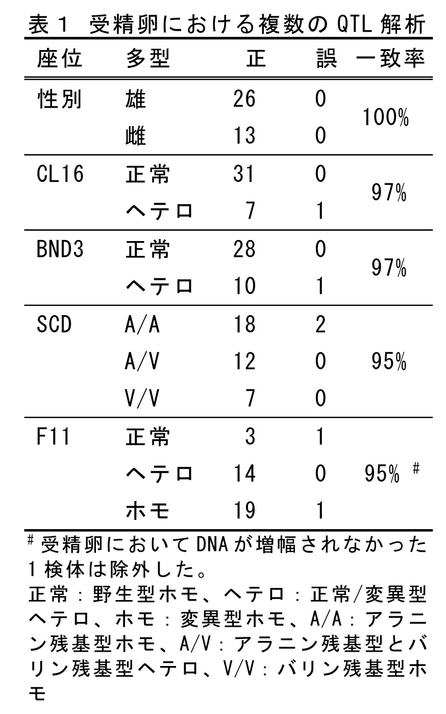 - MDA法を利用して、単一の受精卵(胚盤胞)の10〜20%に相当する細胞から、性別判定ならびにクローディン-16(CL16)、バンド-3(BND3)、ステアリン酸CoA脱飽和酵素(SCD)および血液凝固第XI因子(F11)の遺伝子型を95〜100%の精度で判定できる(表1)。