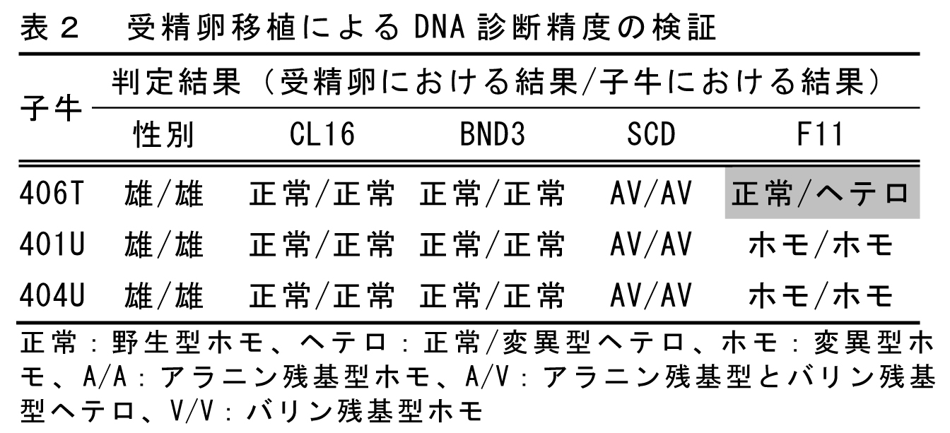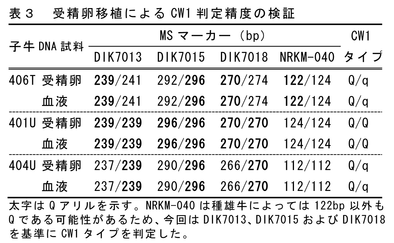- 受精卵移植により生産した子牛3頭の性別判定、遺伝子多型解析およびマイクロサテライトマーカー解析(Carcass weight 1;CW1)を行ったところ、F11における1例の誤判定を除きすべての解析結果が受精卵での解析結果と一致したことから、本法により遺伝形質によっては受精卵段階での選抜が可能である(表2および3)。