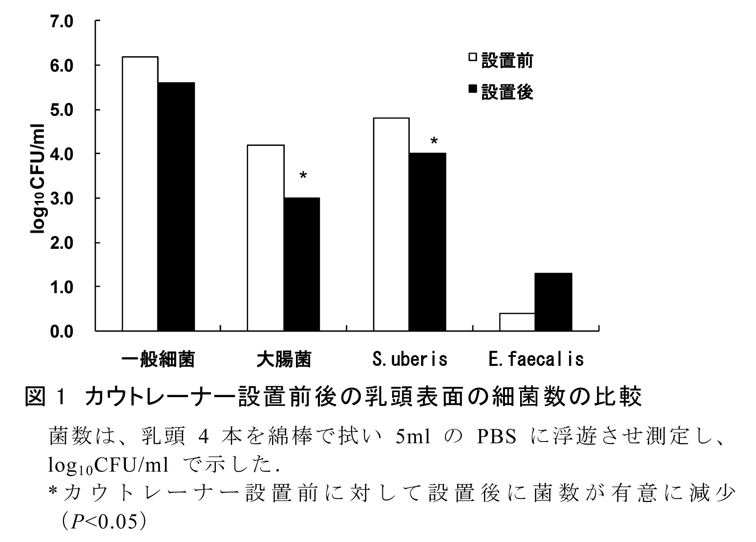 - 繋ぎ飼養では、カウトレーナーで牛床の糞便汚染をコントロールすることにより、乳頭表面の大腸菌やS.uberisが減少する(図1)。