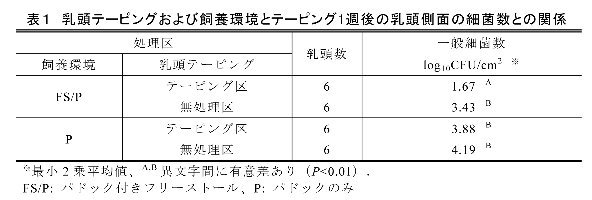 - 乳頭を医療用のフィルムテープと布テープで2重にテーピング(200〜300円/頭)することで、1週間以上(平均9.0日)の乳頭被覆が可能である。乾乳時に異なる飼養環境で乳頭テーピングを実施したところ、清潔なフリーストール牛床とパドックを有する環境(FS/P)ではテーピング1週間後の乳頭表面の菌数は無処理の乳頭に比べ減少する。しかし、パドックのみで乳頭が糞尿に汚染しやすい環境(P)ではテーピングの効果は見られない。乾乳牛の飼養環境は乳頭テーピングの効果に影響を及ぼすと考えられる(表1)。