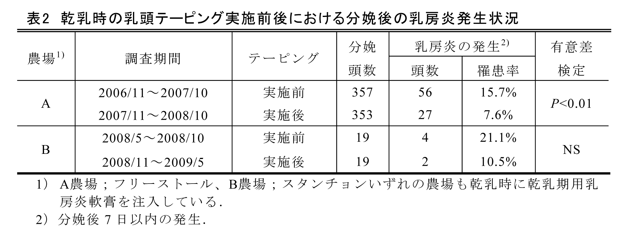 - 乾乳時の乳頭テーピングを実施した2農場(A農場;フリーストール、B農場;スタンチョン)では、テーピング実施前と比較して実施後には分娩直後1週間の乳房炎が減少し(表2)、泌乳初期の乳汁中体細胞数も低減する傾向が認められる。