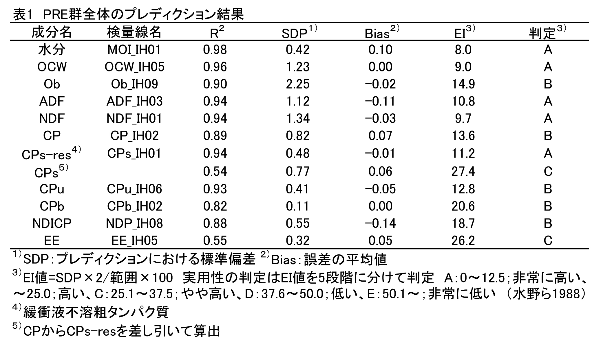 - 2009年度までに収集された輸入イネ科乾草263点(チモシー95点、オーツヘイ77点、クレイングラス51点およびライグラス40点)のスペクトルデータから検量線作成用標準サンプル群を選抜して検量線を作成する一方、残りを精度検定用未知サンプル群(PRE群)として作成した検量線の精度を検証したところ、草種を込みにした判定ではいずれの検量線においても推定可能と判断されるC判定以上の精度が得られている (表1)。