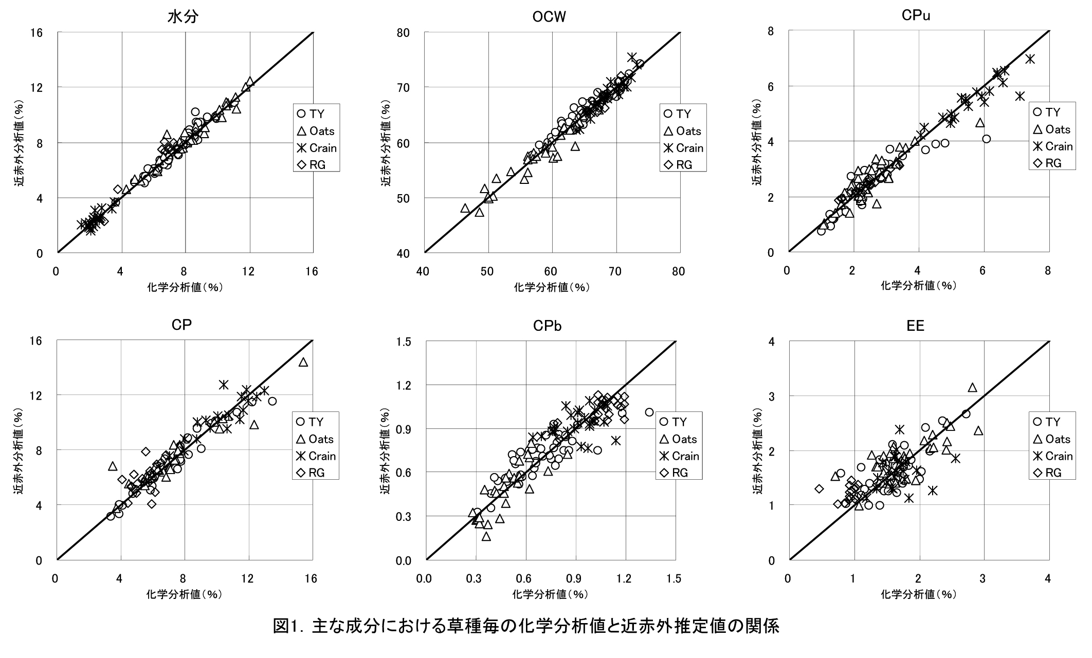 - 草種別の精度の検証において、水分、総繊維(OCW)、酸性デタージェント繊維(ADF)、中性デタージェント繊維(NDF)、非分解性タンパク質(CPu:図3)の各検量線は、チモシー乾草(TY)、エン麦乾草(Oats)、クレイングラス乾草(Crain)およびライグラス乾草(RG)の4草種全てで精度が安定して維持されている。また、粗タンパク質(CP) の検量線はRGを除く3草種で、中性デタージェント不溶タンパク質(NDICP)の検量線はCrainを除く3草種で、結合性タンパク質(CPb)および粗脂肪(EE)の検量線はTYおよびOatsの2草種において精度が安定して維持されている。