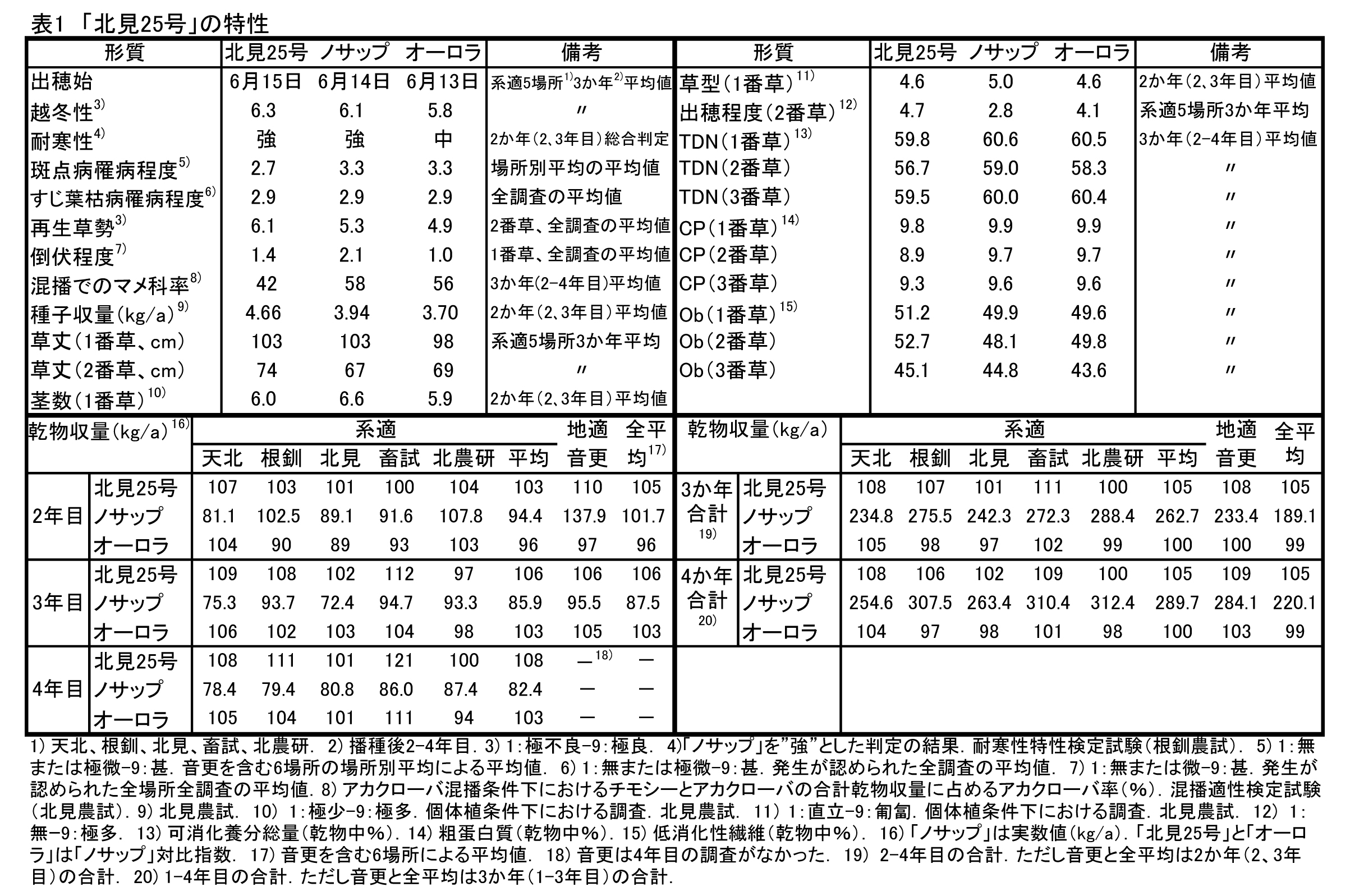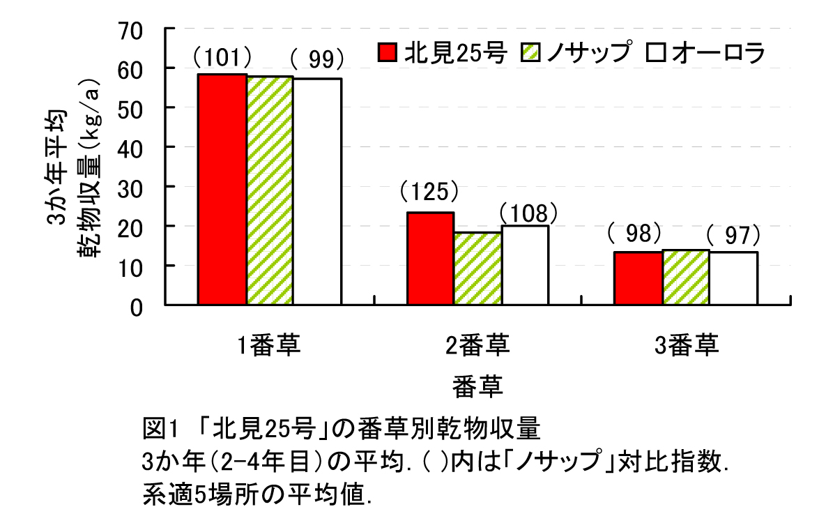 - 3か年(2〜4年目)ならびに4か年(1〜4年目)の合計乾物収量はいずれも、「ノサップ」、「オーロラ」より多く、年次別乾物収量は、2年目以降は「ノサップ」、「オーロラ」より多収である(表1)。