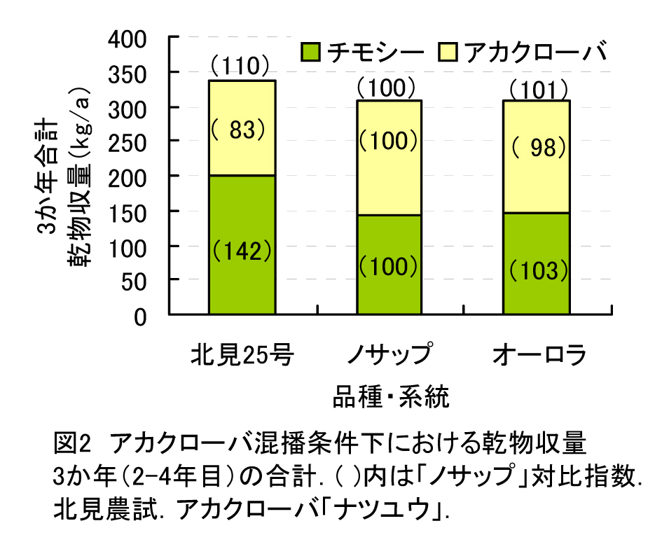 - 混播栽培における競合力は、アカクローバ混播条件下における3か年の合計乾物収量が、チモシー収量、チモシーとアカクローバとの合計収量ともに「ノサップ」、「オーロラ」より多く(図2)、またマメ科率は、「ノサップ」、「オーロラ」と比べ低く、より適正な値で推移することから(表1)、「ノサップ」、「オーロラ」より優れる。
