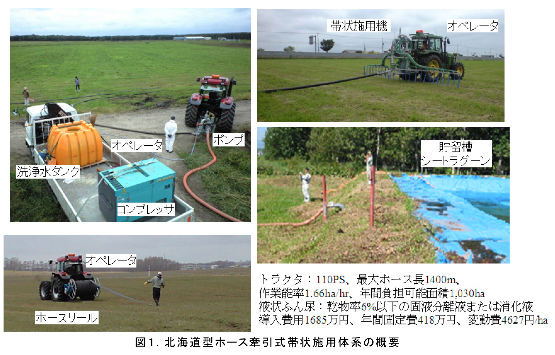 北海道の圃場条件に応じて小型化した帯状施用機に、牽引式ホースでふん尿を供給する機械体系は、悪臭等の環境対策、早春早期施用による増収とふん尿施用面積の拡大に寄与し、導入経費低減を要するが、液状ふん尿の地域利用システム確立研究に有効である。