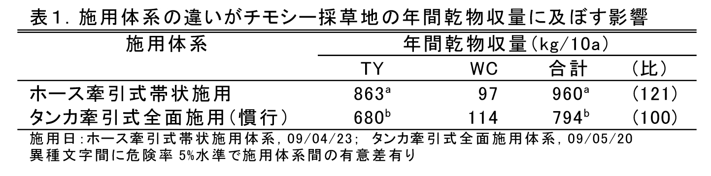 - 同一施用時期の場合、帯状施用は慣行の全面施用と同等の施用効果を示す(データ省略)。本体系はタンカを牽引せず軽量なので、融雪後早期の施用が可能であり、その場合、5月中旬の施用に対して約2割の増収を期待できる(表1)。