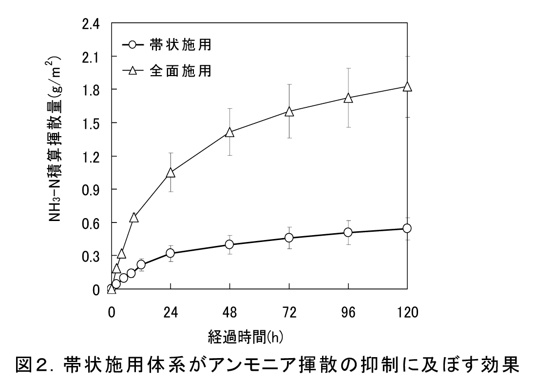 - 液状ふん尿施用後の臭気拡散とアンモニア揮散については、帯状施用に期待される抑制効果を確認できる(図2)。また、亜酸化窒素の排出については、透水性のやや悪い土壌条件に帯状施用した場合、全面施用よりも抑制効果が認められる(データ省略)。