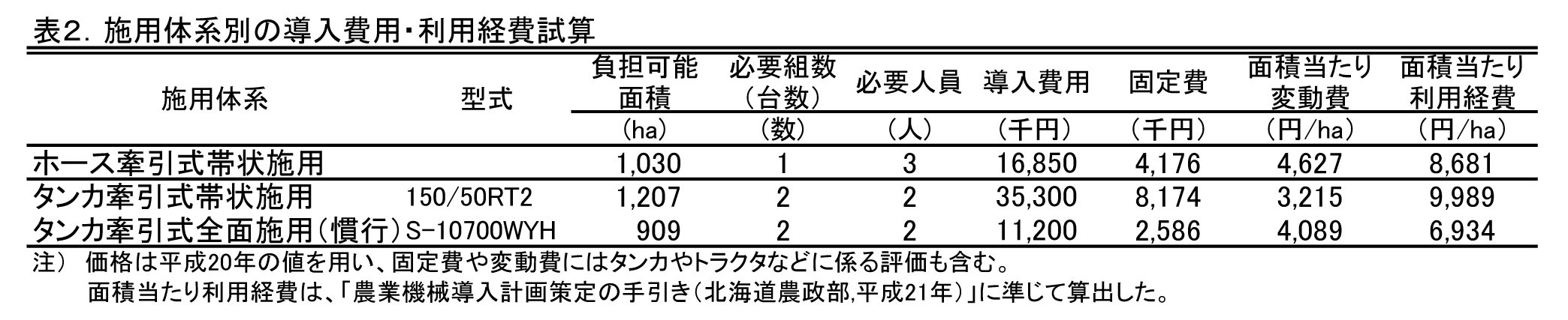 - 本体系は導入費用1,685万円、年間固定費418万円、面積当たり変動費4,627円/haと試算される。集落営農的な共同利用を想定して年間負担面積を1,000ha程度とすると、各圃場近傍に貯留槽既設の条件では、本体系の利用経費は慣行のタンカ牽引式全面施用体系より高いが、タンカ牽引式帯状施用体系とは遜色ない程度になる可能性がある(表2)。以上の結果、本体系は導入経費の低減を要するが、環境に配慮し、効率的な液状ふん尿の地域利用システム確立研究において、実証的に導入する供試体系として有効である。