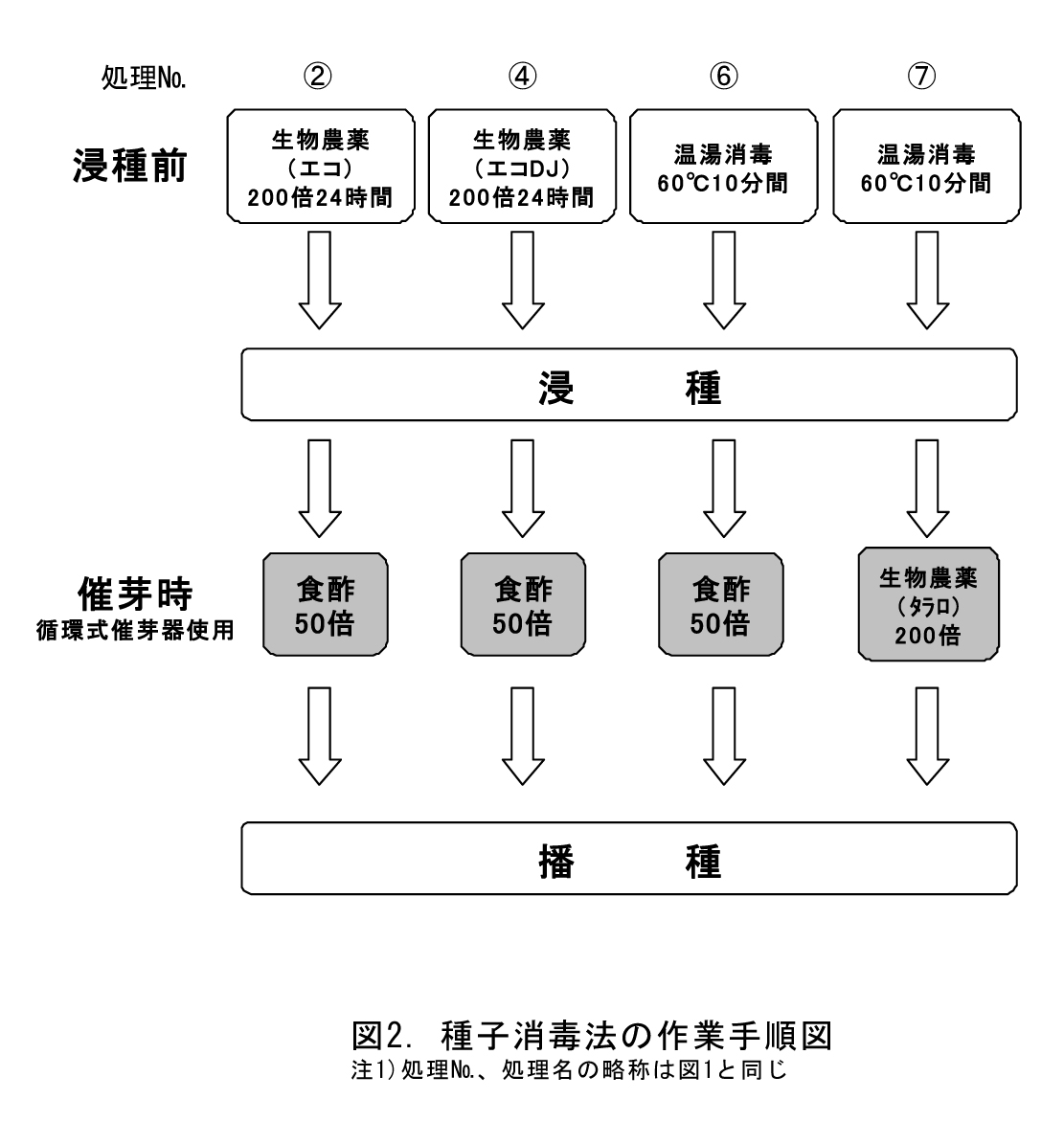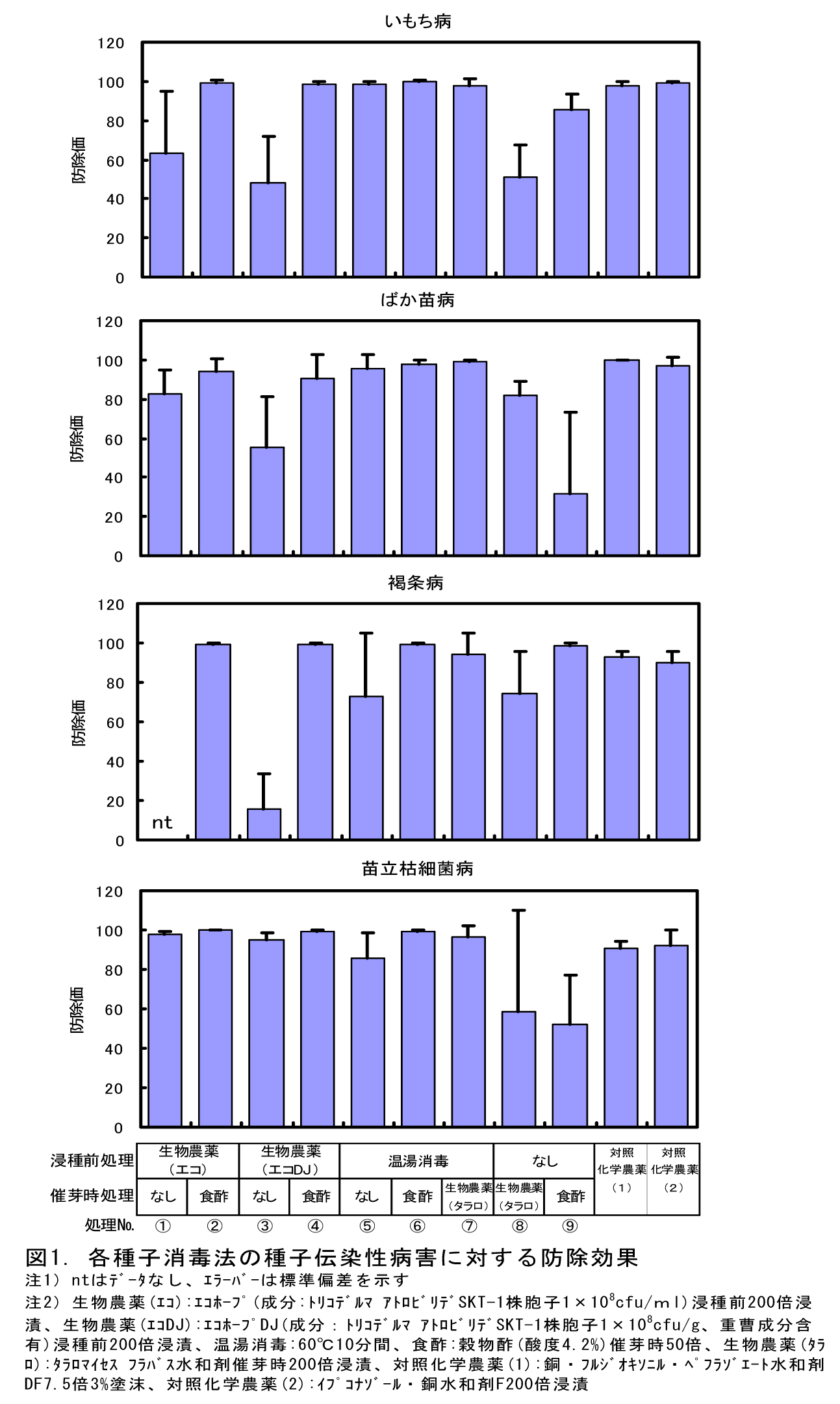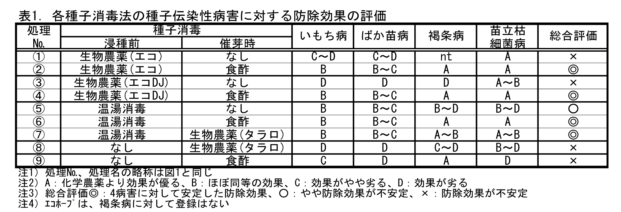 - 浸種前および催芽時に生物農薬、温湯消毒、食酢を目的に応じ組み合わせて使用することにより、化学合成農薬が使用できない場面でも化学農薬とほぼ同等以上の防除効果が得られる(図2、表1)。