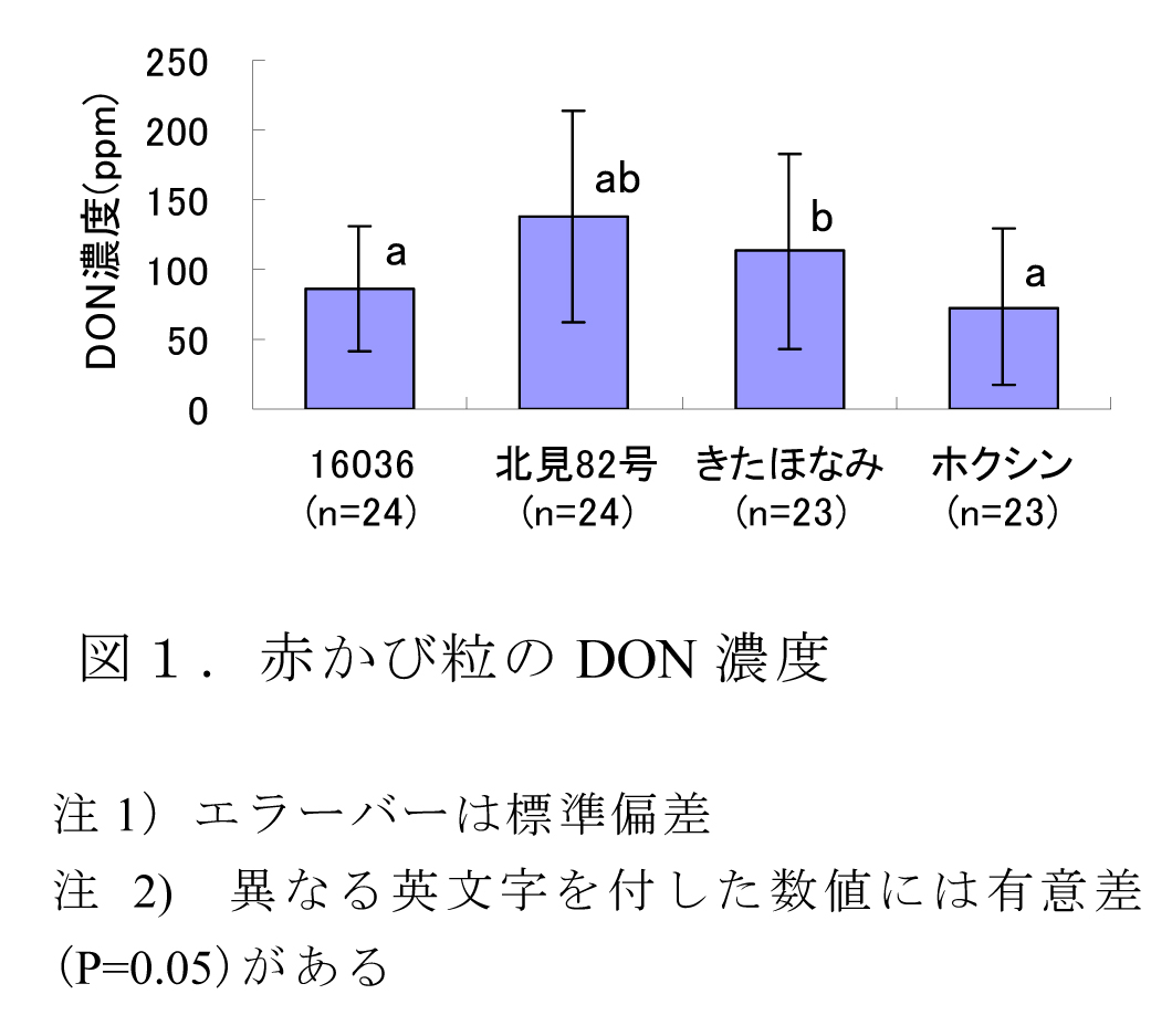 - 抵抗性“やや強”の「北見82号」および“強”の「16036」では、赤かび病の発生が少なく、DON濃度も低い傾向を示すことから、赤かび病抵抗性品種の導入はDON汚染リスクの低減に有効である。