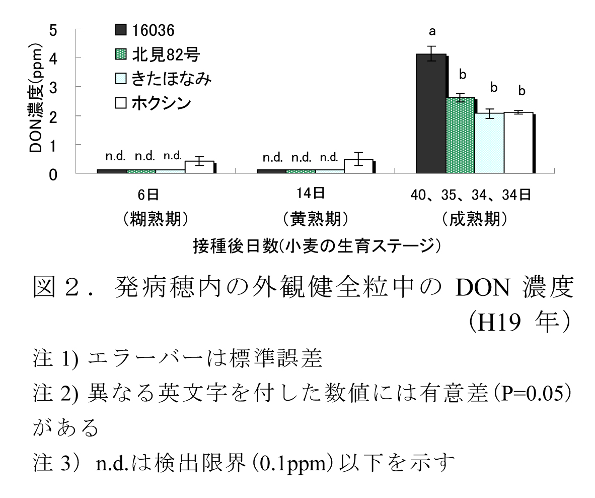- 「16036」では発病小穂からの進展は、抵抗性”やや弱”である「ホクシン」と比較して少ない傾向を示すが、発病穂内の外観健全粒のDON濃度については、成熟期になると「16036」は低い試験事例もあったが、逆に高い試験事例もあり、品種・系統間差は判然としなかった(図2)。