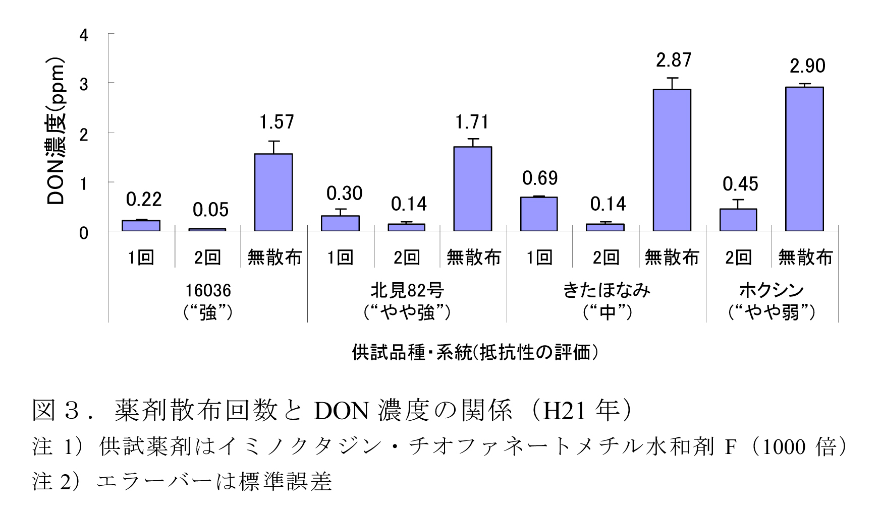 抵抗性“強”系統であっても発病穂のDON汚染リスクは高いので、感染防止が必要で、開花時期の薬剤散布が重要である。薬剤散布回数と赤かび病の防除効果を評価し、各抵抗性程度に応じた薬剤防除の考え方を示した。