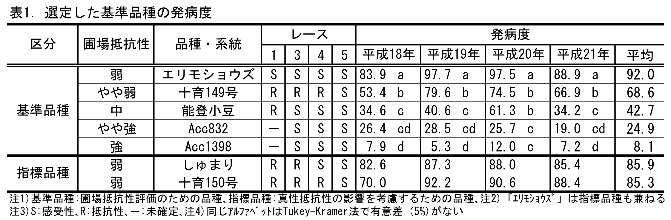 - 「エリモショウズ」(すべてのレースに感受性)、「しゅまり」(レース1、3に抵抗性)、「十育150号」(レース1、3、4に抵抗性)の3品種・系統を指標品種として用い、これらの品種がほぼ同程度に発病する圃場を検定圃場とすることで、真性抵抗性の影 響を極力排除した圃場抵抗性の評価ができる(表1)。