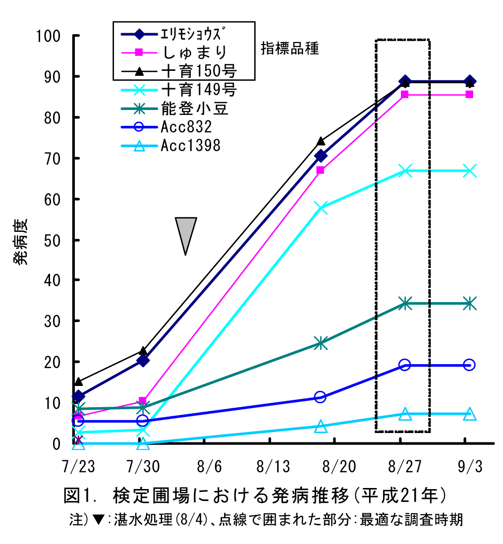 「エリモショウズ」、「十育149号」、「能登小豆」、「Acc832」、「Acc1398」を基準品種に用いて、8月初旬に16時間湛水処理し、湛水処理3週間後の8月下旬に発病調査を行うことで、アズキ茎疫病に対する圃場抵抗性が適切に評価できる。