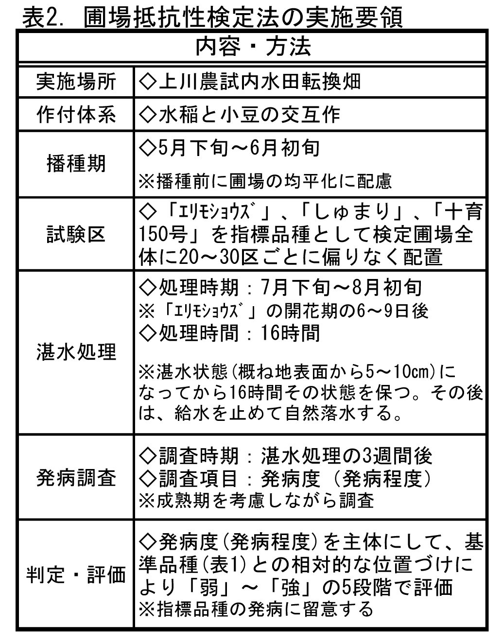 3.圃場抵抗性評価のための基準品種として、「エリモショウズ」(圃場抵抗性“弱”)、「十育149号」(同“やや弱”)、「能登小豆」(同“中”)、「Acc832」(同“やや強”)、「Acc1398」(同“強”)を用いる(表1)。圃場抵抗性検定法の実施要領を表2に示す。