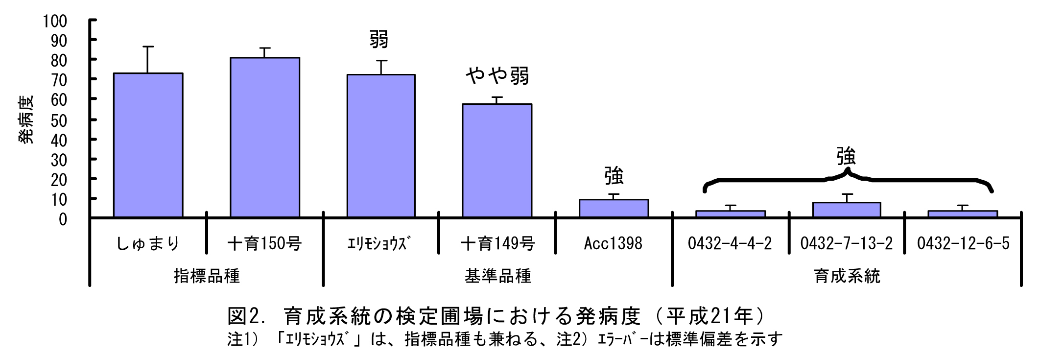 4.本検定法を用いて、「十交0432」(エリモショウズ/Acc1398)の雑種後代であるF6世代系統の圃場抵抗性を評価すると“強”にランクされる(図2)。
