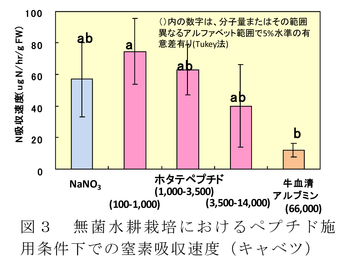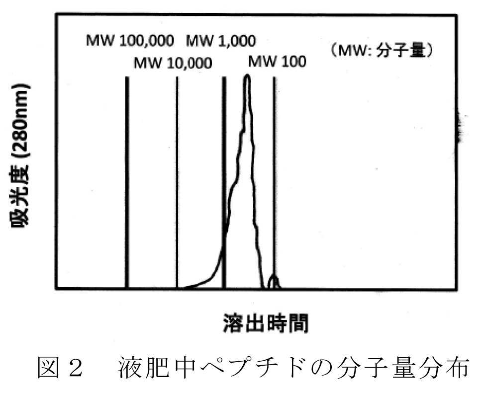- 有機液肥は、分子量1,000以下のペプチドを含有し(図2)、窒素は植物によって速やかに吸収される(図3)。