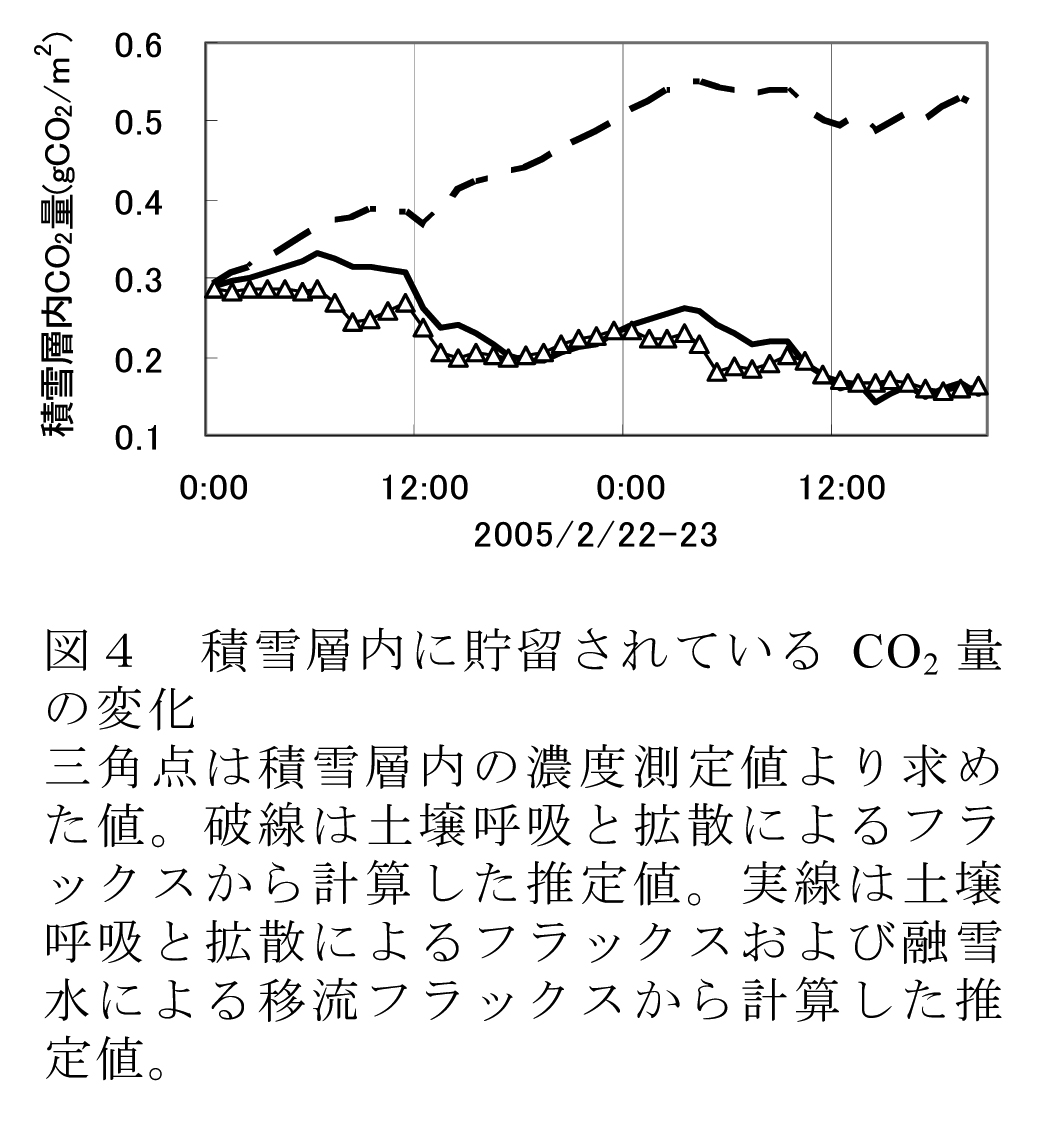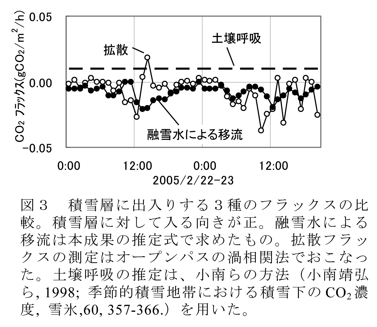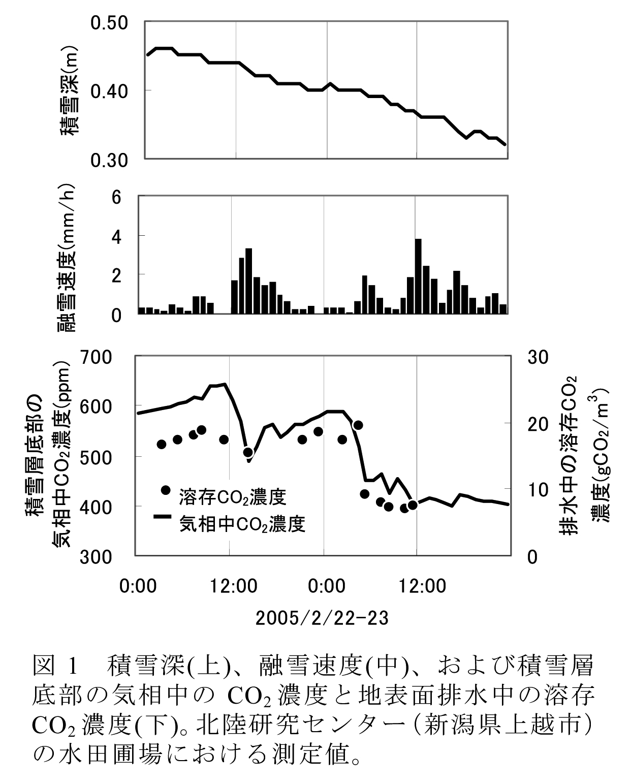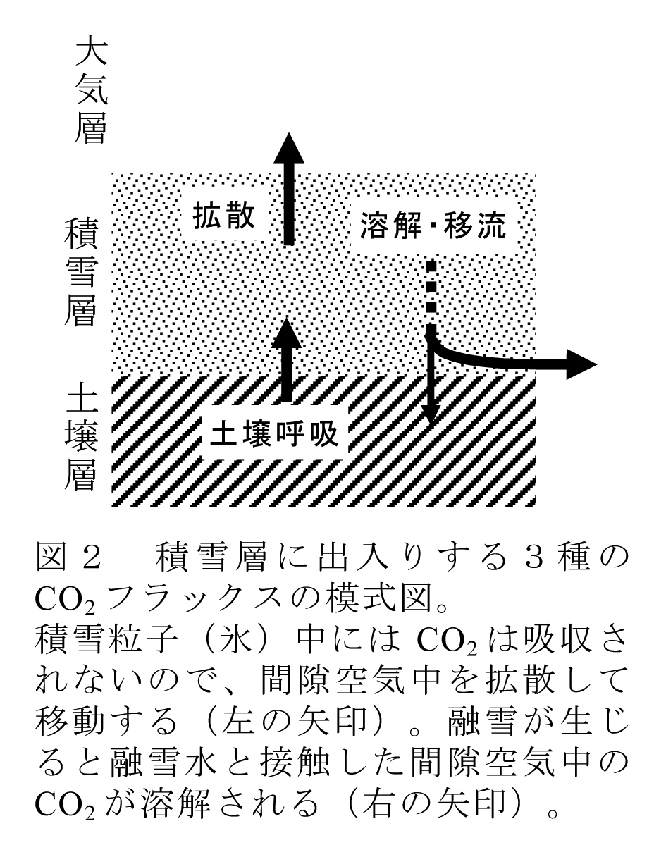 北陸地方などの多雪地帯では、融雪期に融雪水によって積雪層内のCO2が溶解・移流されて流出しており、その強度は積雪層底部の気相中CO2濃度と融雪速度とによって推定できる。