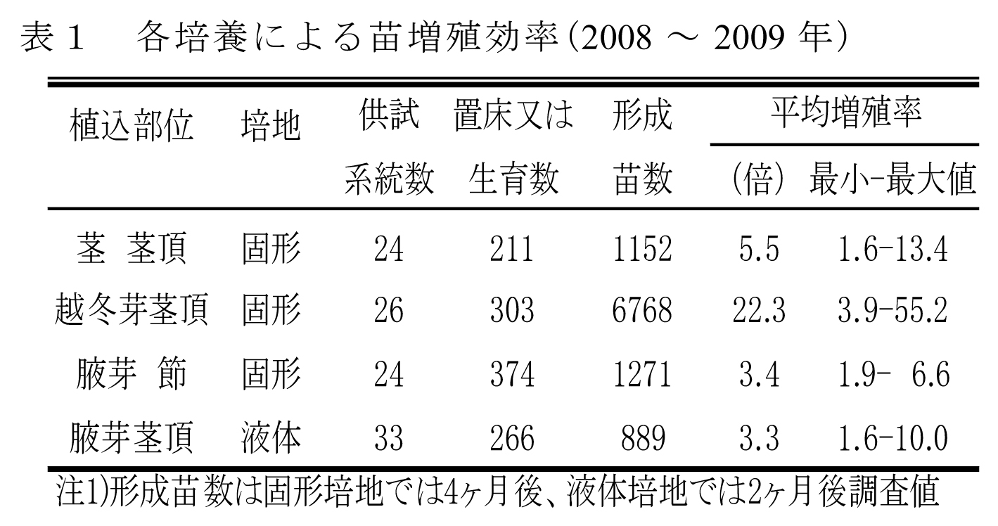 - 液体培養(NH4NO3 1/2量のMS培地、0.01mg/L TDZ、30g/Lショ糖)での腋芽増殖についても、平均すると節培養と同程度の増殖率であるが、比較的高い増殖率を示す系統があること、培養中は継代作業が不要であることから、増殖の一手法として有効である(表1)。