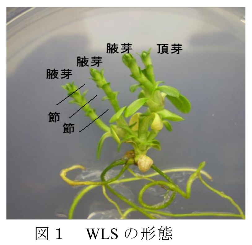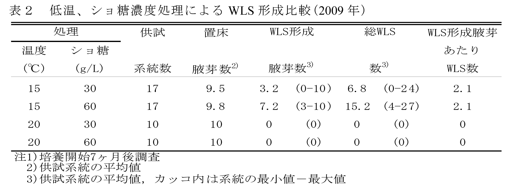 - 越冬性向上に有効とされる越冬芽様芽条(WLS)は、NH4NO3 1/2量のMS培地に0.01mg/L NAA添加の寒天培地、15℃の低温、ショ糖濃度60g/Lの培養条件で、効率的に形成される(表2、図1)。