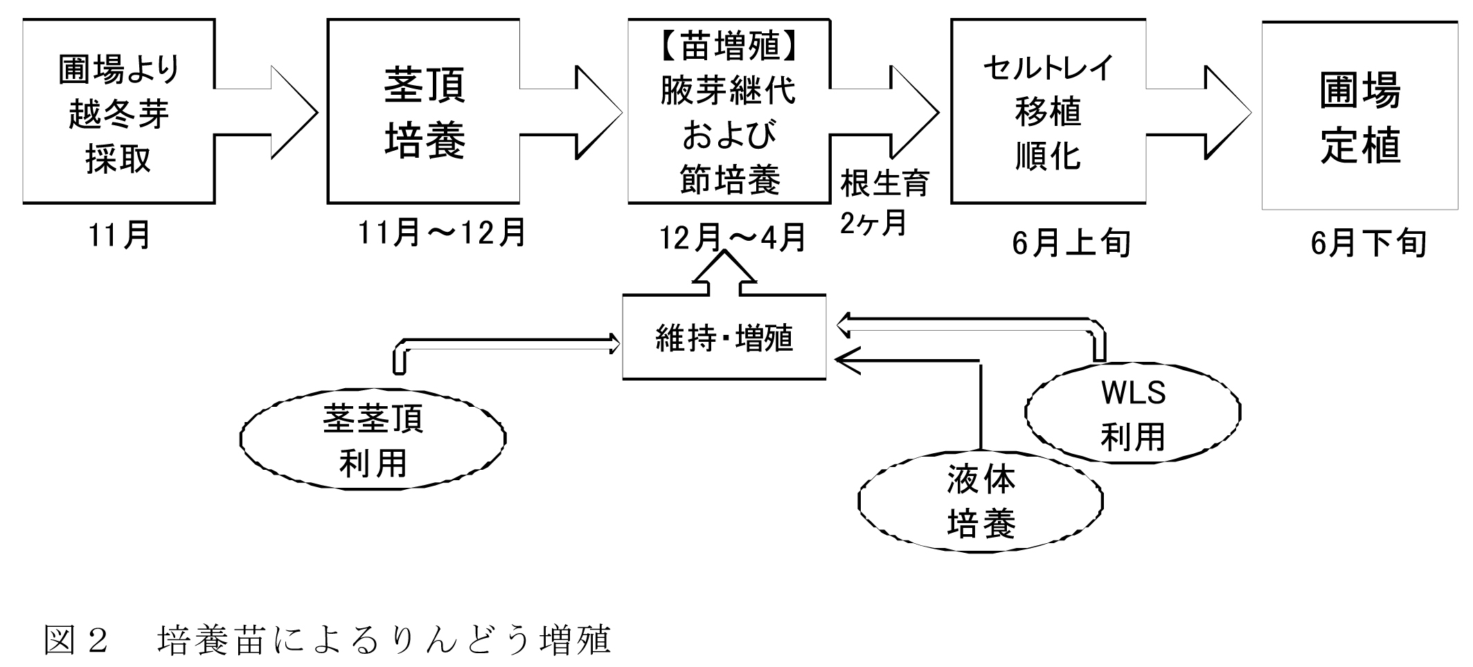 - 上記の方法を用いて、12月からの越冬芽茎頂培養での腋芽、節培養による増殖で苗数を確保し、発根、鉢上げ、順化行程を連続して行い、翌年6月には圃場に定植することができる(図2)。