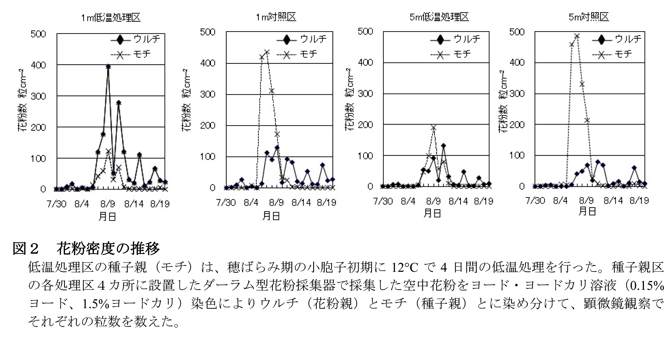 - 花粉親由来のウルチ花粉と種子親由来のモチ花粉をダーラム型花粉採集器で採取し、ヨード・ヨードカリ溶液染色により識別して空中花粉密度を調べたところ、花粉親(ウルチ)のピークが8月7〜12日、種子親(モチ)の対照区のピークが8月6〜9日、同低温処理区のピークが8月7〜11日の間にあり、花粉親と種子親との間で花粉密度のピークがほぼ一致している(図2)。