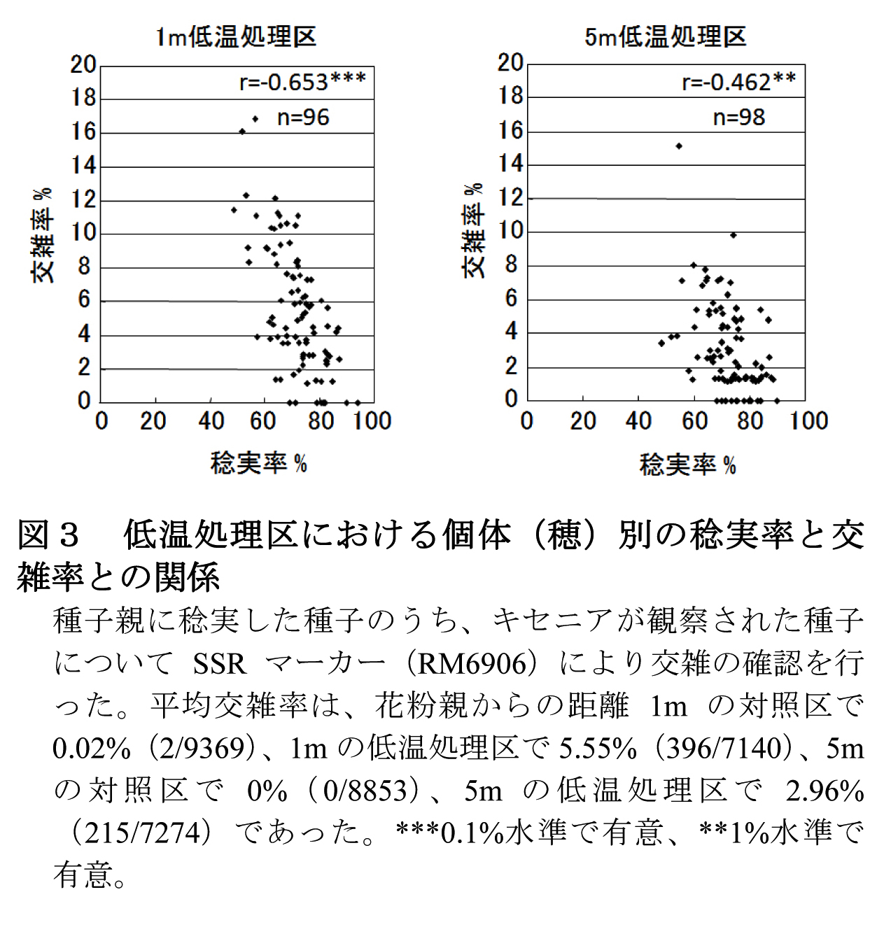 - 個体(穂)別の稔実率と交雑率との間には、花粉親からの距離1mの低温処理区でr=-0.653***(n=96)、同5mの低温処理区でr=-0.462**(n=98)と有意な負の相関関係が認められ(図3)、低温による雄性不稔化で稔実率が低下したイネでは交雑率が高まる。