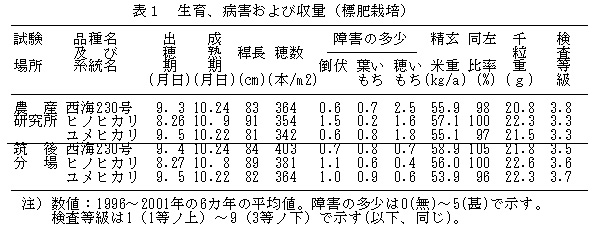 出穂期は1〜2日早く、成熟期は2日程度遅い晩生に属する粳種である。耐倒伏性は優れ、強である。葉いもちおよび穂いもち圃場抵抗性は同程度かやや弱い。穂発芽性はやや難(データ略)で、収量性は優る(表1)。